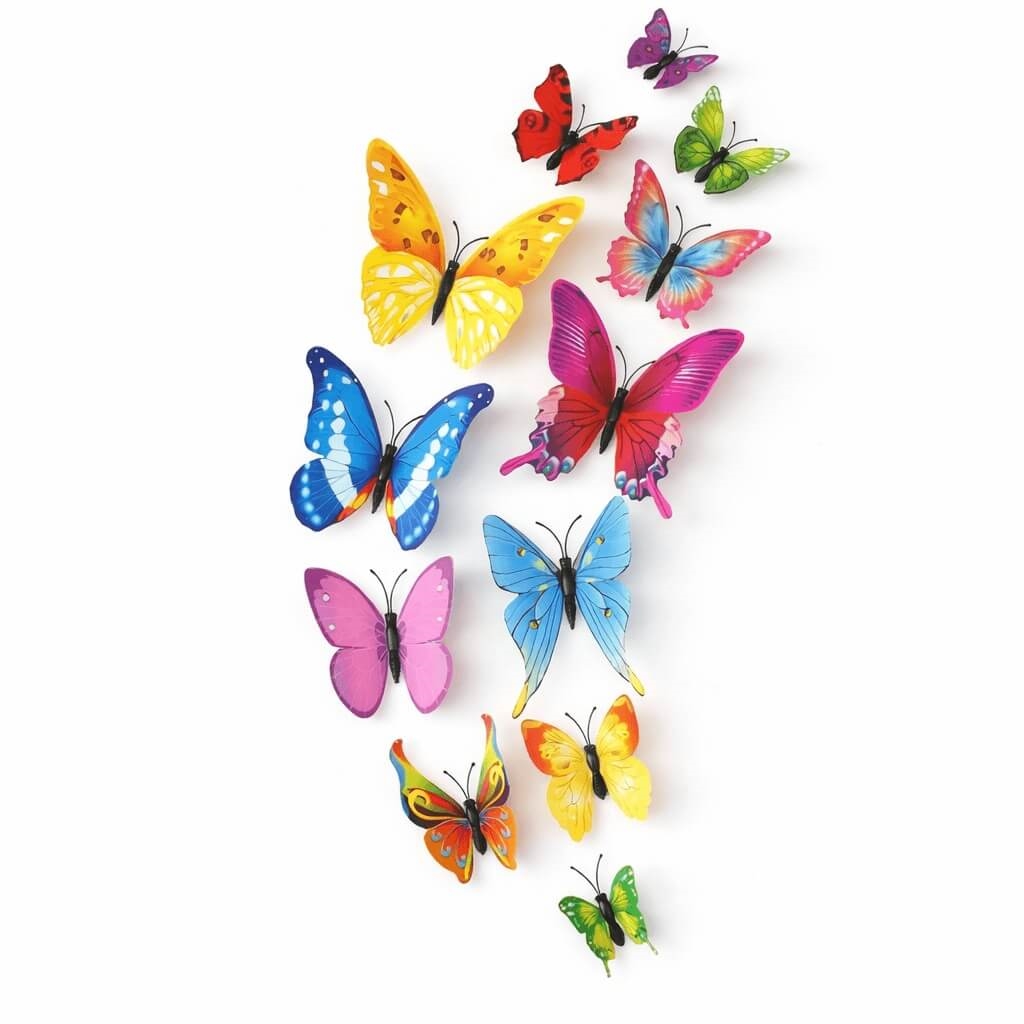 Farverige 3D sommerfugle vægdekoration i farvemix med 12 dekorative sommerfugle i forskellige størrelser og farver.