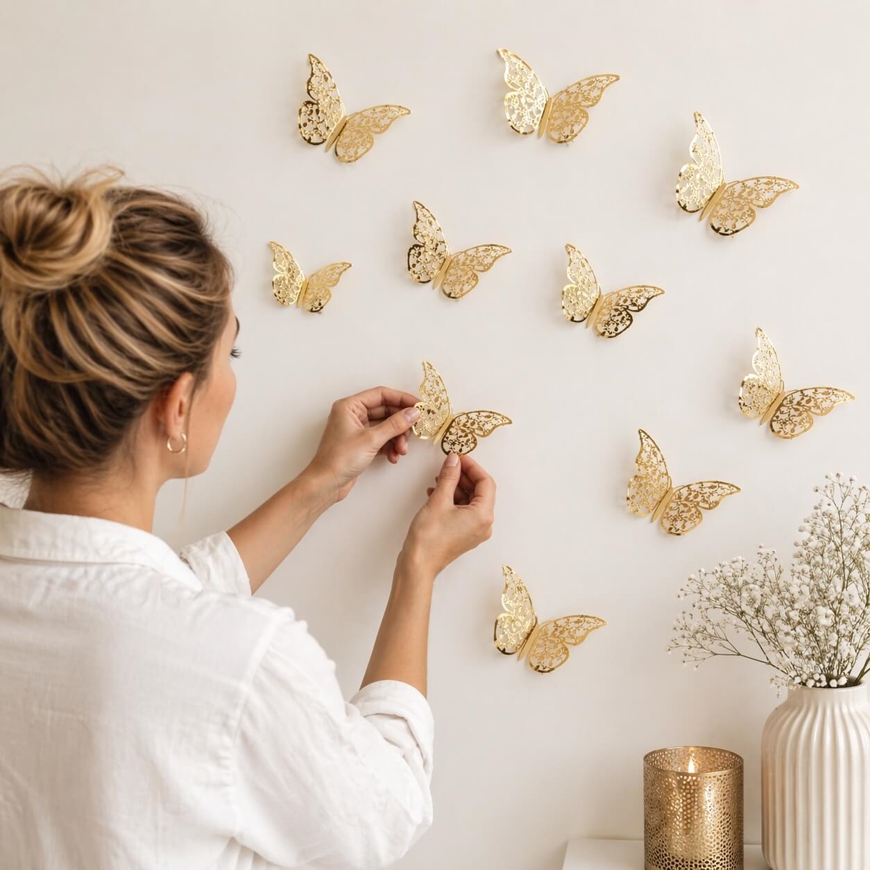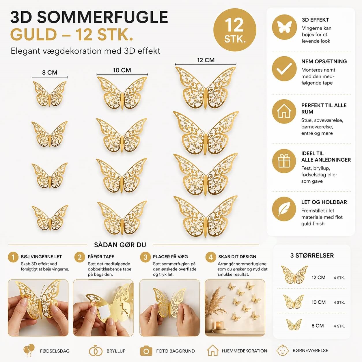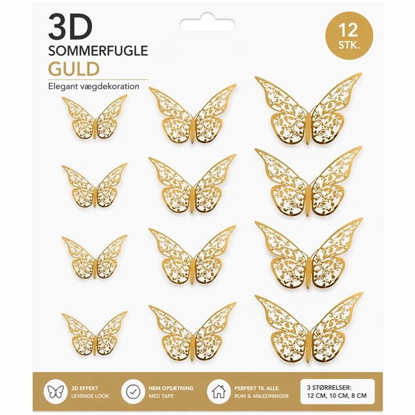 3D sommerfugle guld 12 stk wallstickers i forskellige størrelser til vægdekoration3D sommerfugle guld vægdekoration opsat på væg i moderne bolig indretningPerson sætter 3D sommerfugle i guld op på væg som elegant vægdekoration3D sommerfugl guld close up detalje med 3D effekt vægdekoration wallstickers3D sommerfugle guld 12 stk infografik med størrelser opsætning guide og vægdekoration inspiration