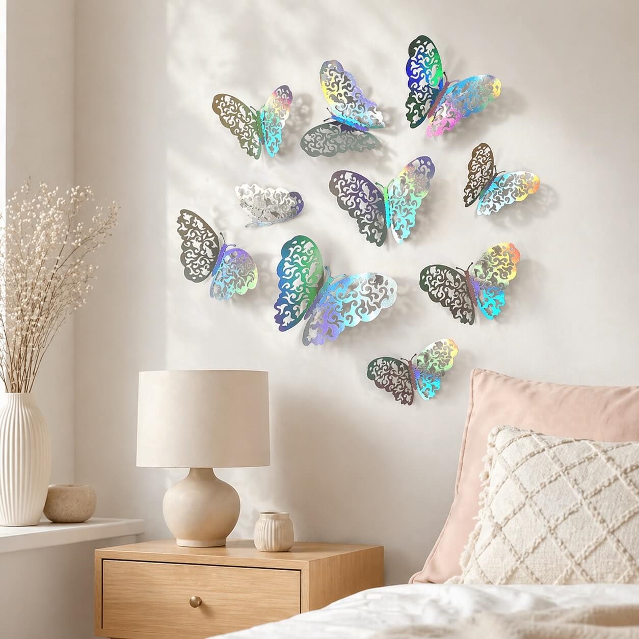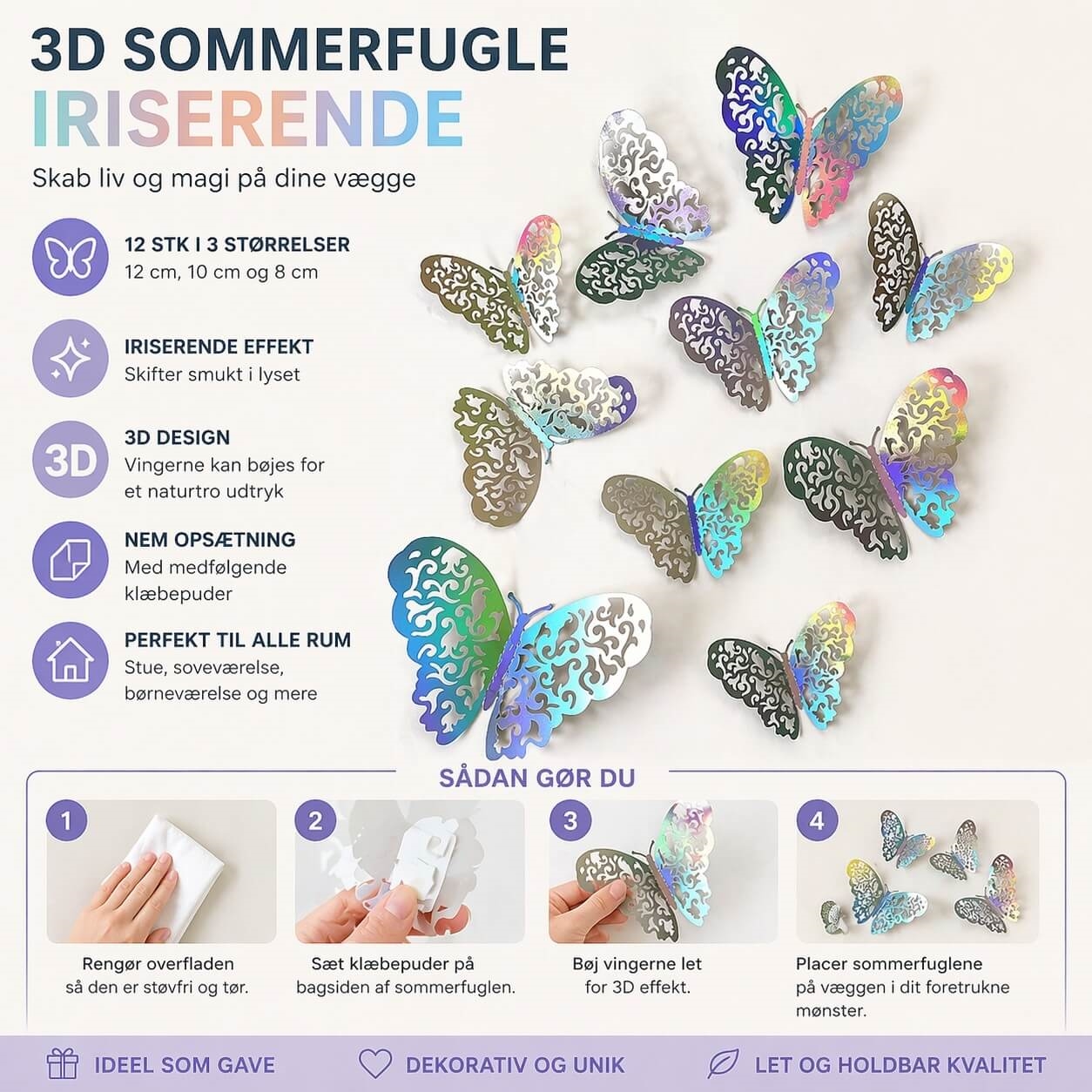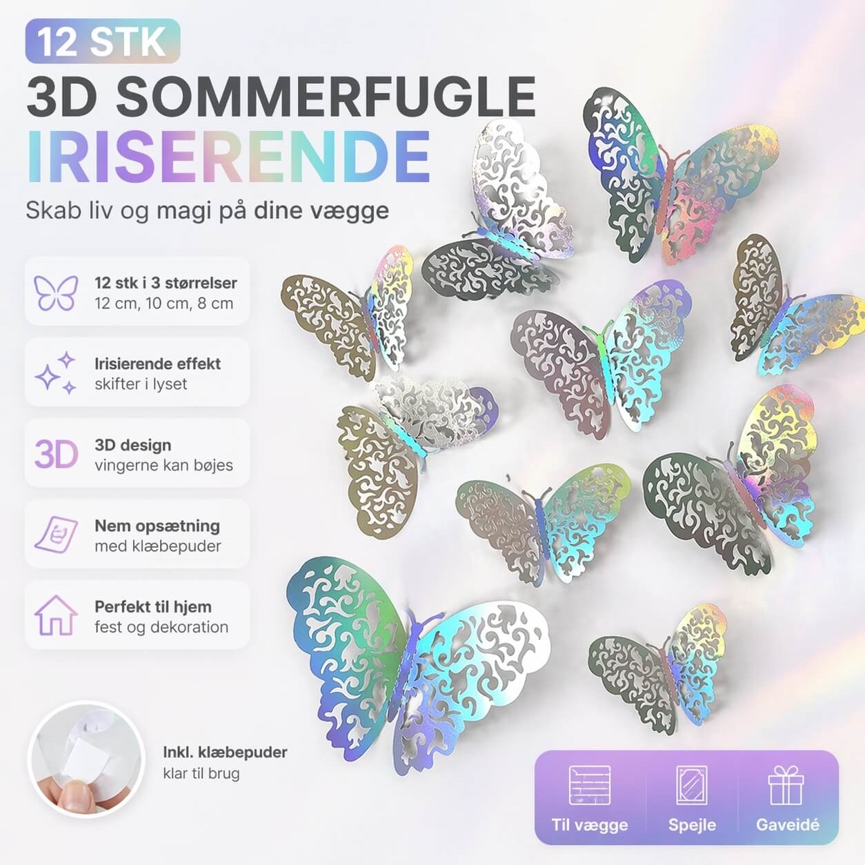 3D sommerfugle iriserende 12 stk vægdekoration med 3D effekt og nem opsætningIriserende 3D sommerfugle som vægpynt i hjem med flot lys og dekorativ effekt3D sommerfugle iriserende vægdekoration opsat på væg i soveværelse med 3D effektClose-up af 3D sommerfugl iriserende med detaljerede vinger og farveskiftende effekt3D sommerfugle iriserende 12 stk infografik med mål, opsætning og 3D vægdekoration