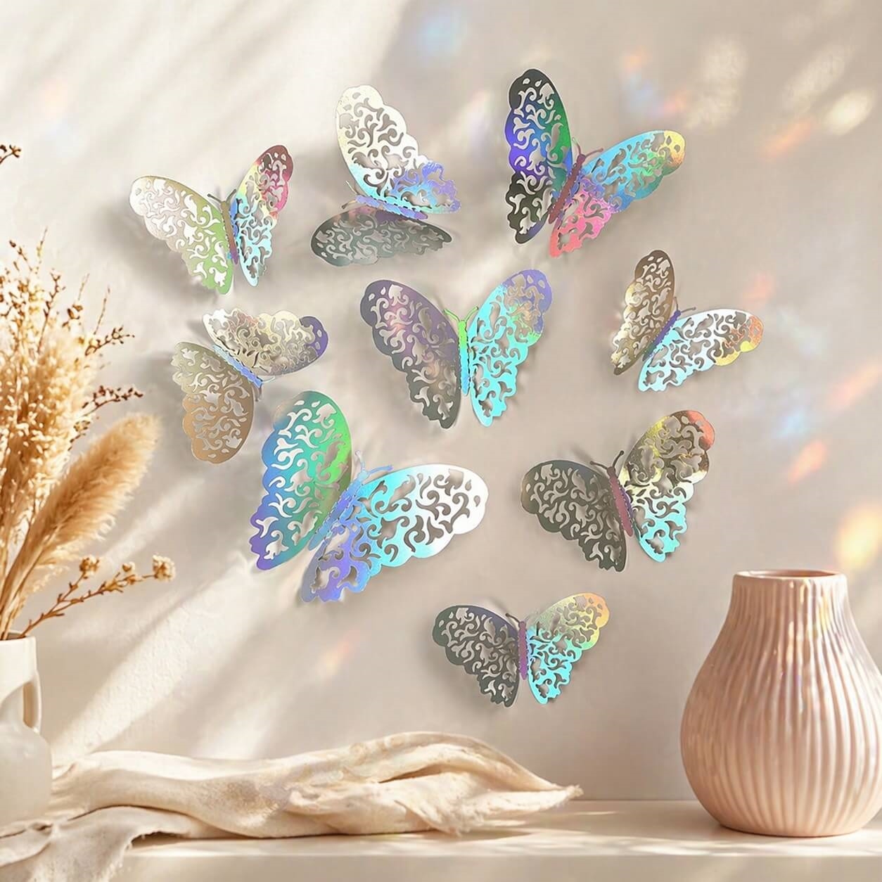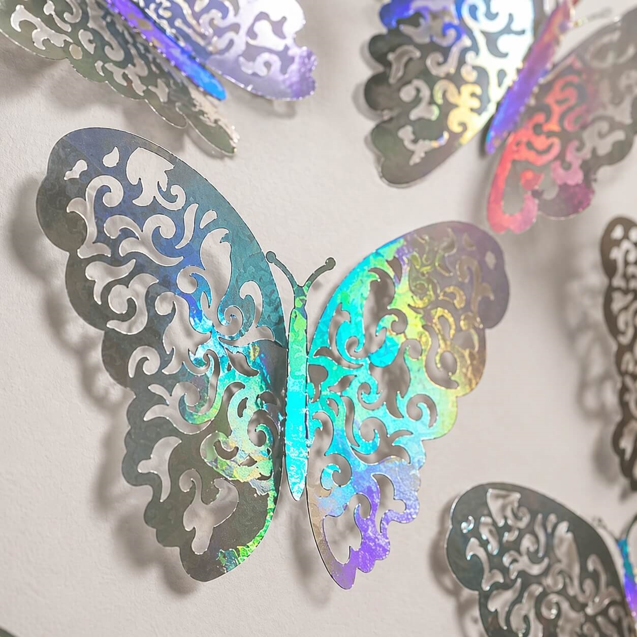 Disse 3D sommerfugle i iriserende sølv giver en unik effekt, hvor farverne changerer i lyset og skaber et elegant og eksklusivt look.