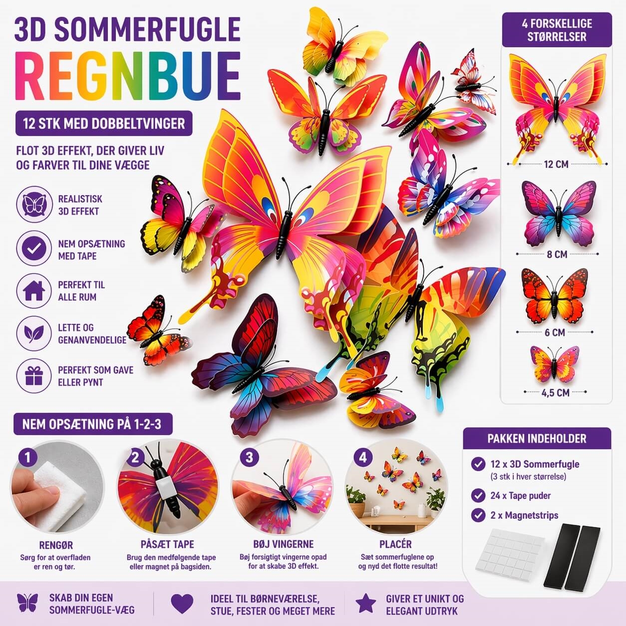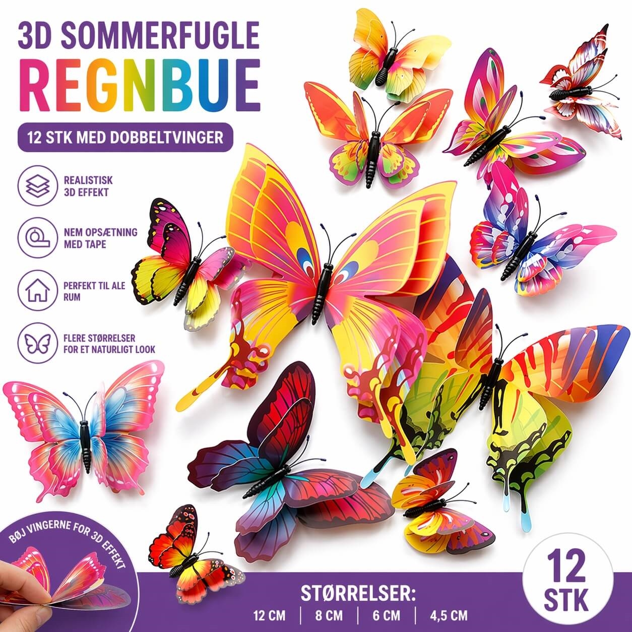 Du får 12 stk 3D sommerfugle i regnbue farver i 4 forskellige størrelser: