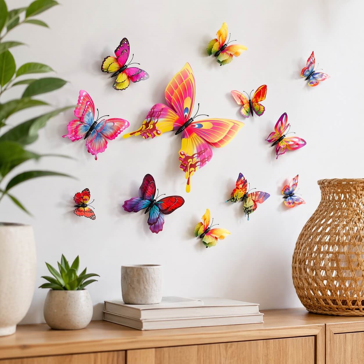 Med disse 3D sommerfugle i regnbue farver får du en dekorativ og realistisk vægdekoration, der giver liv til ethvert rum.