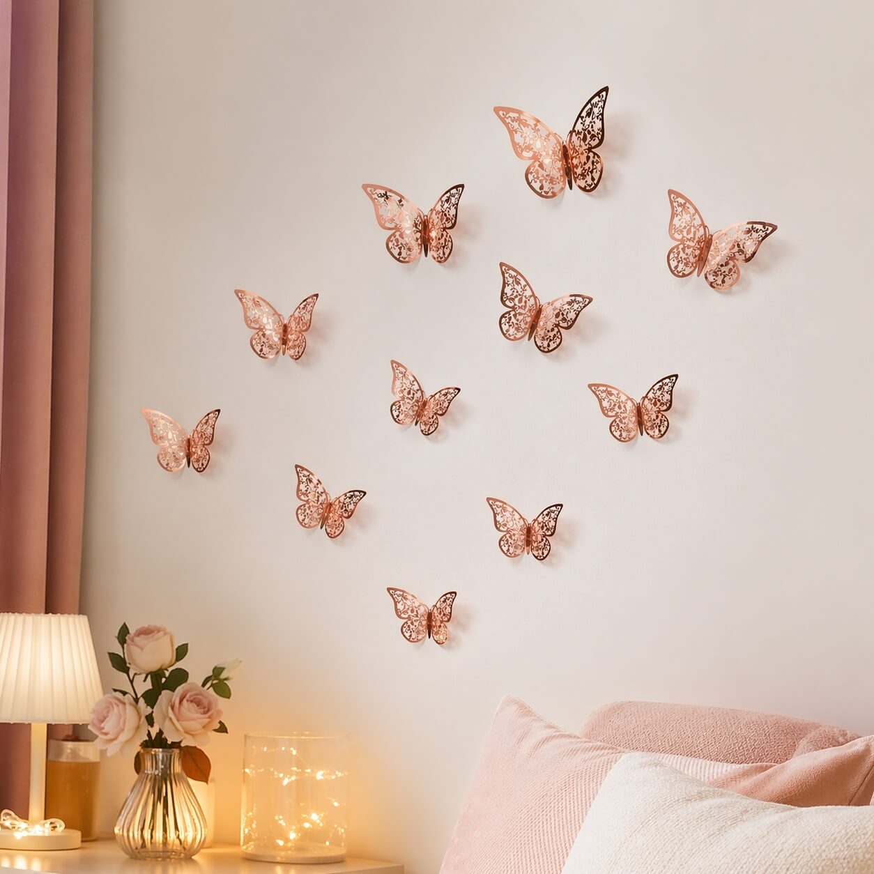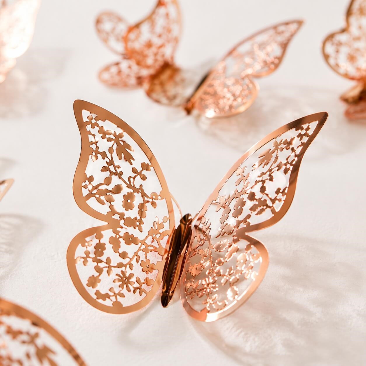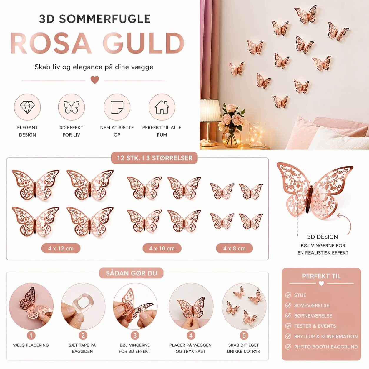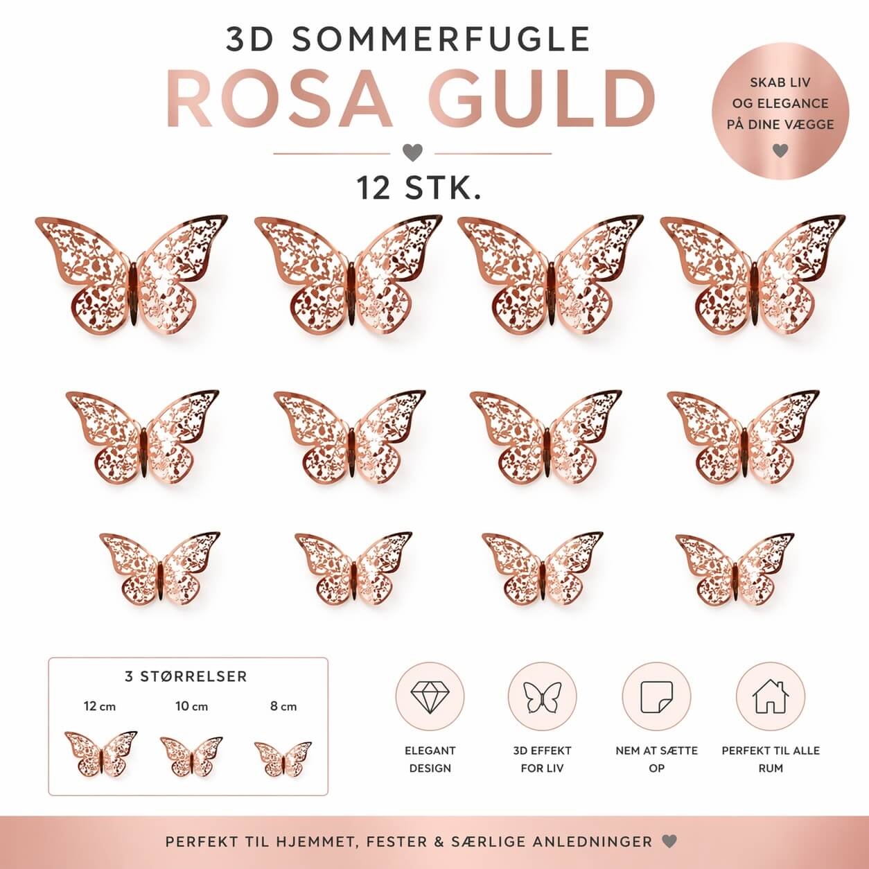 Disse 3D sommerfugle i rosa guld er den perfekte vægdekoration, der skaber en smuk 3D effekt og giver liv til dine vægge.