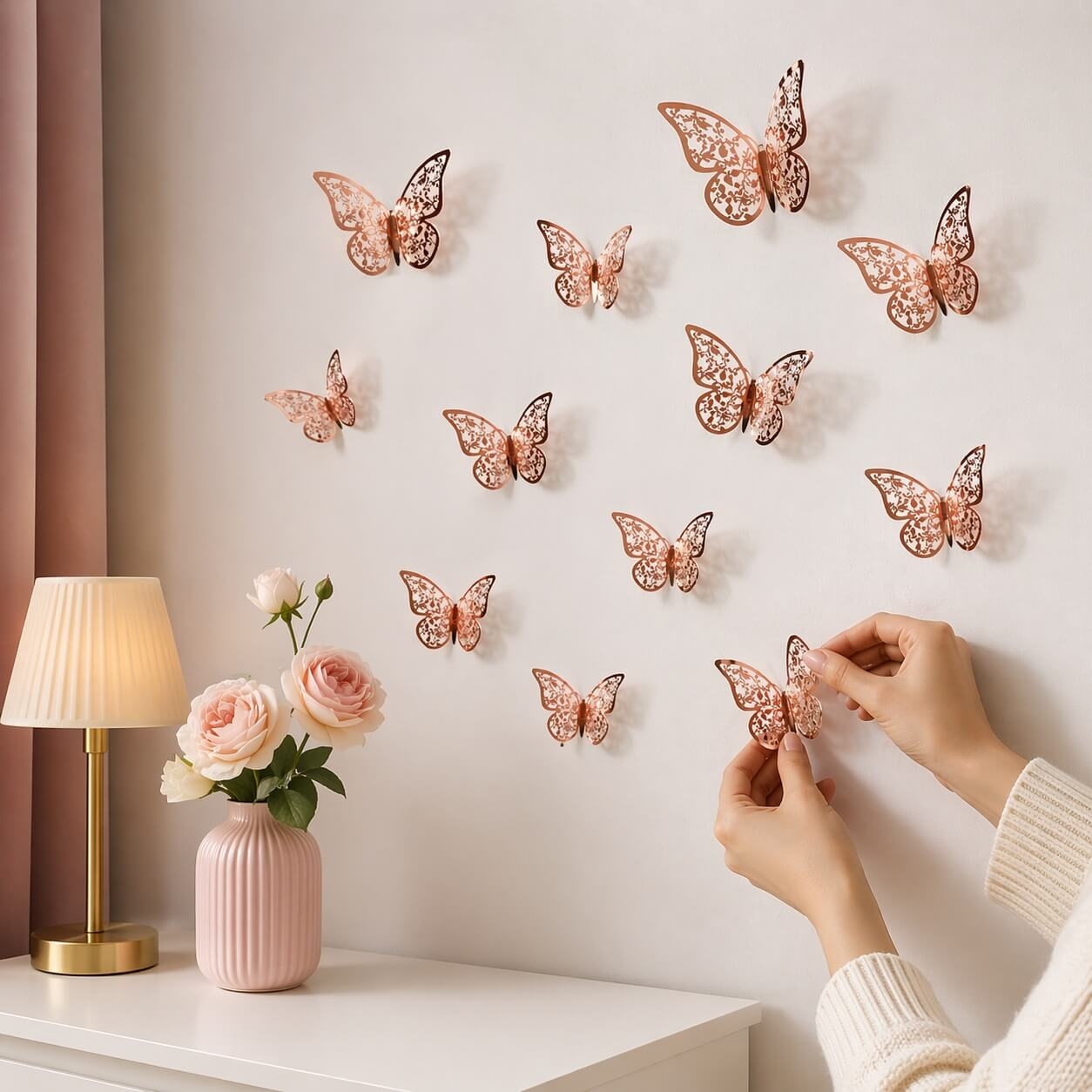 3D sommerfugle rosa guld 12 stk vægpynt i 3 størrelser med elegant design og 3D effekt3D sommerfugle rosa guld vægdekoration i hyggelig boligindretning med lampe og blomster3D sommerfugle rosa guld vægpynt opsætning med hånd montering i bolig indretningClose-up af 3D sommerfugl i rosa guld med detaljeret mønster og 3D effekt til vægdekoration3D sommerfugle rosa guld 12 stk infografik med størrelser og montering til vægdekoration