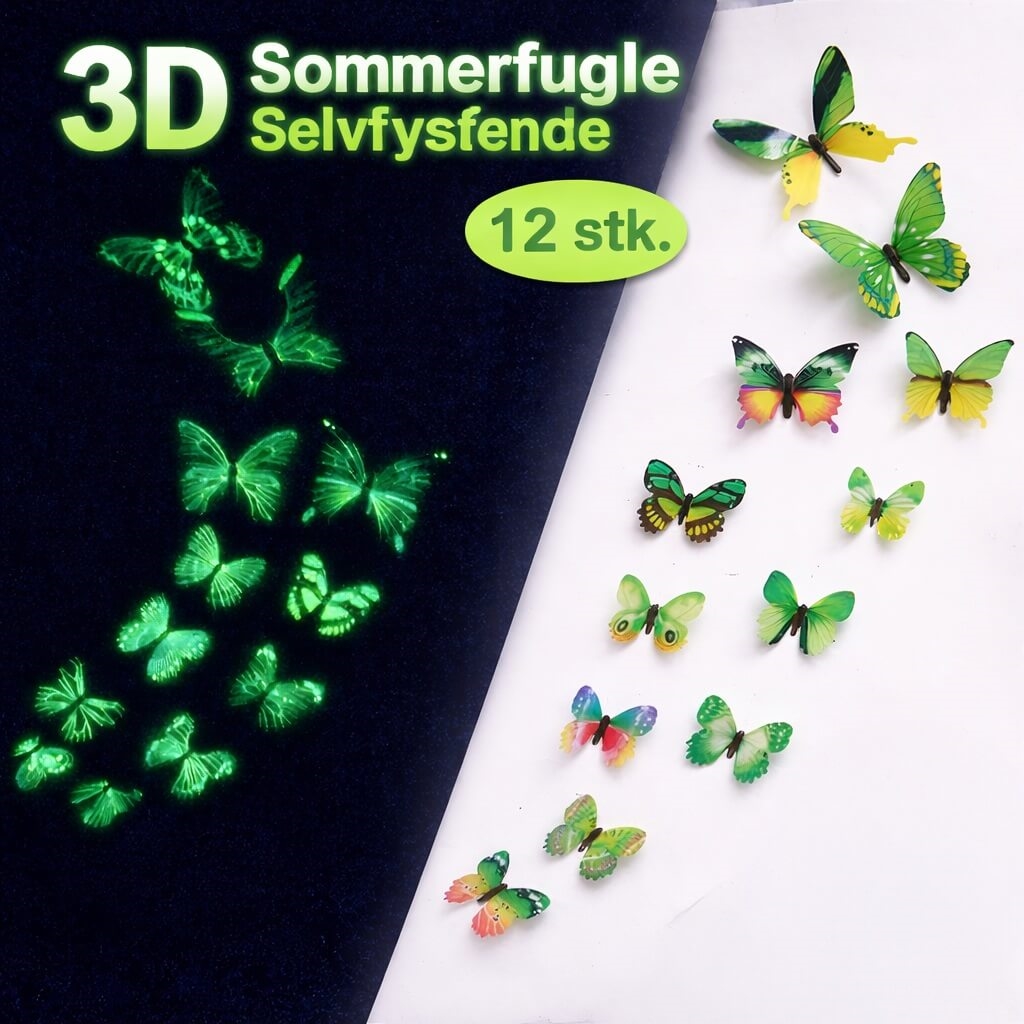 3D Sommerfugle Grønne Selvlysende – 12 stk.