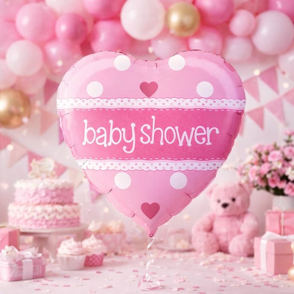 Pink hjerteformet folie ballon med Baby Shower tekst, 45 cm baby shower ballon til pyntPink hjerteformet baby shower ballon i pyntet festlokale med kage, gaver og baby shower dekorationerPink baby shower festlokale med ballonbue, bordpynt og hjerteformet baby shower ballon