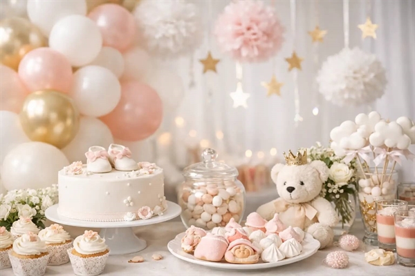 Den klassiske stil er sød, genkendelig og festlig. Her ser man ofte lyserød eller lyseblå kombineret med hvid, sølv eller guld. Det fungerer godt, hvis du ønsker en traditionel babyshower med tydeligt tema.