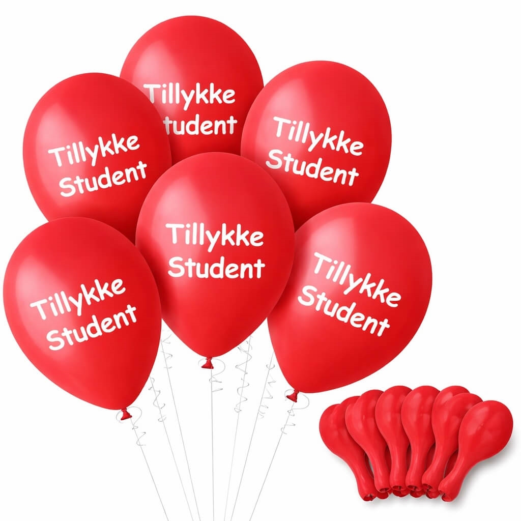 • Røde balloner med “Tillykke Student”-tryk