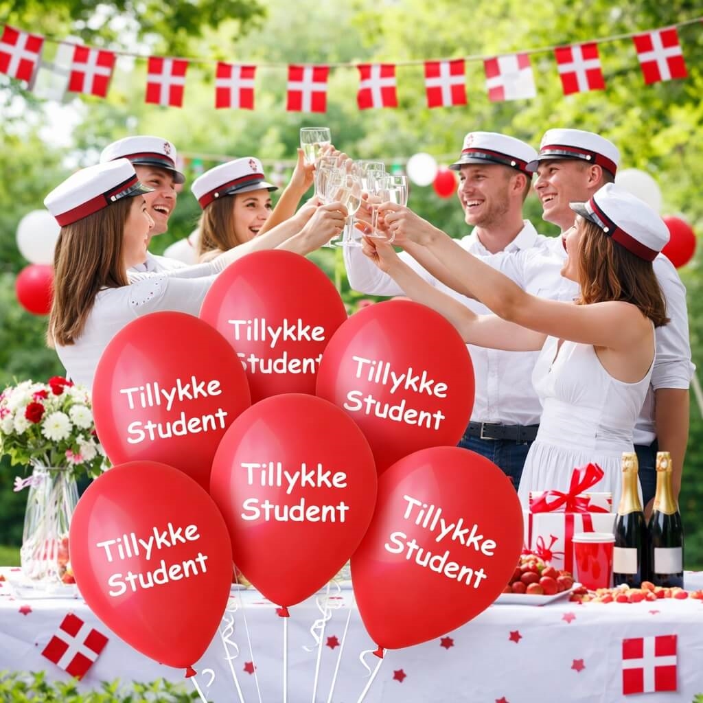 Studenterfest med røde balloner med teksten Tillykke Student, festbord og studenterhueStudenterfest pyntet med røde balloner med teksten Tillykke Student og festbord med danske flagRøde balloner med teksten Tillykke Student – pakke med 10 stk til studenterfestStudenterfest med røde balloner med teksten Tillykke Student og studenter der skåler med champagne
