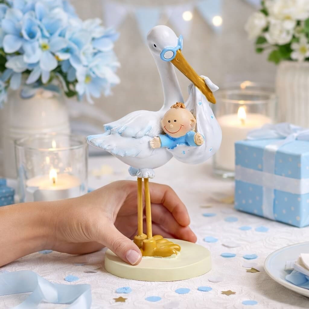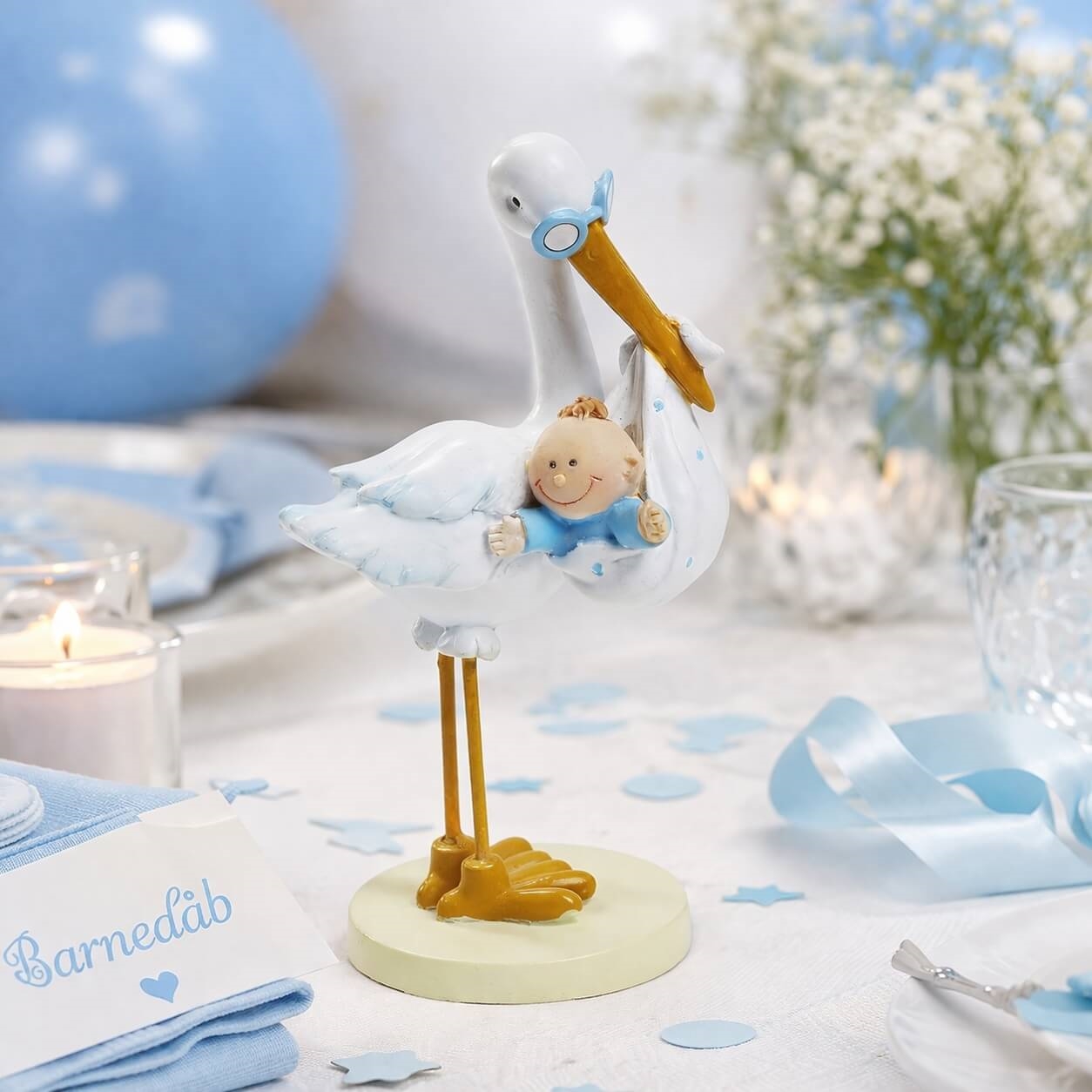 En stork med baby er perfekt som bordpynt til barnedåb dreng, hvor den skaber en sød og personlig stemning. Den kan også bruges til baby shower, gavebord eller som dekoration i hjemmet.