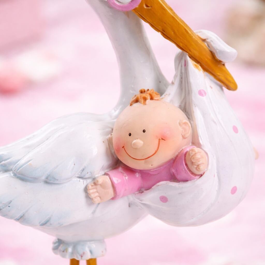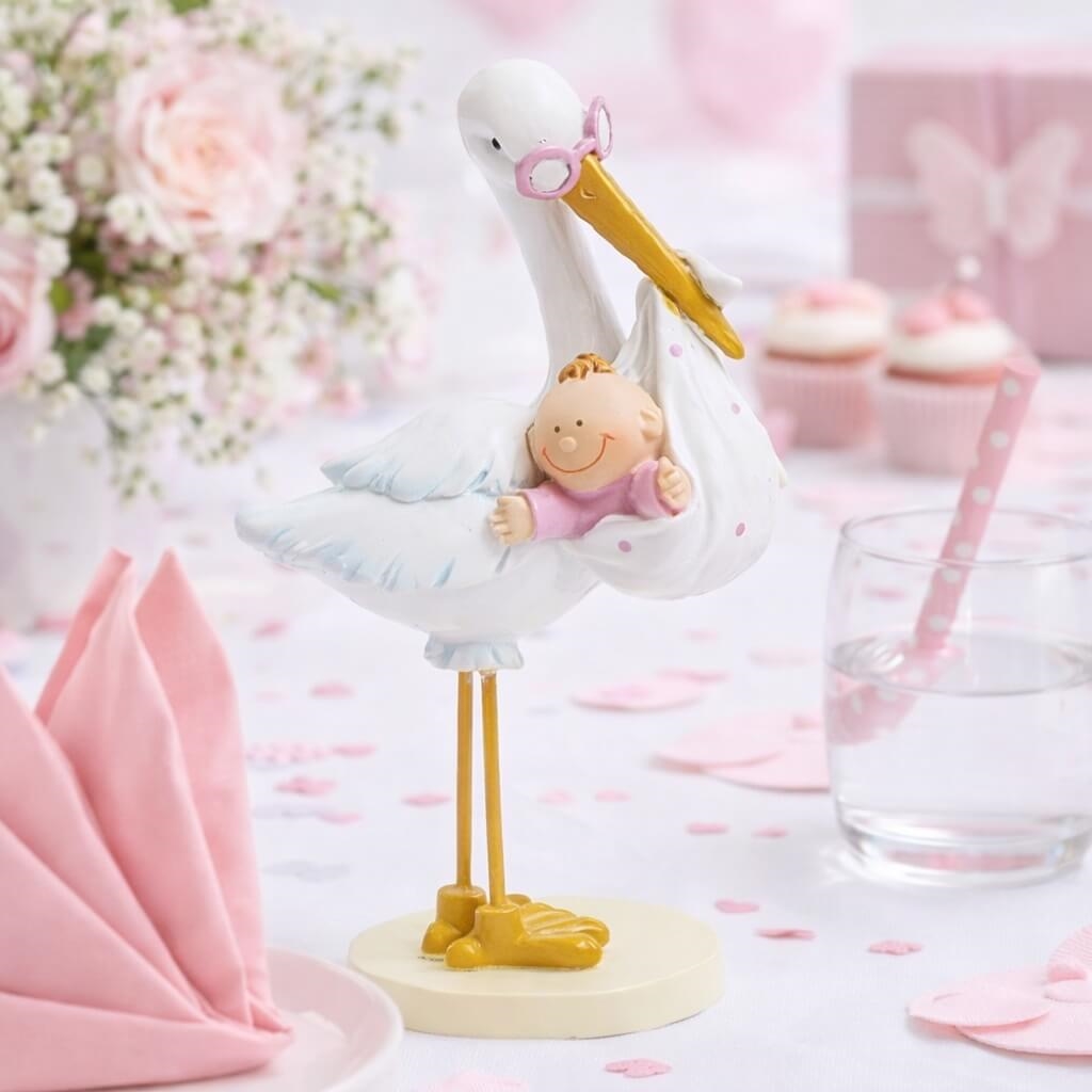 Barnedåbspynt stork med baby pige 11 cm – sød bordpynt til barnedåb & baby shower
