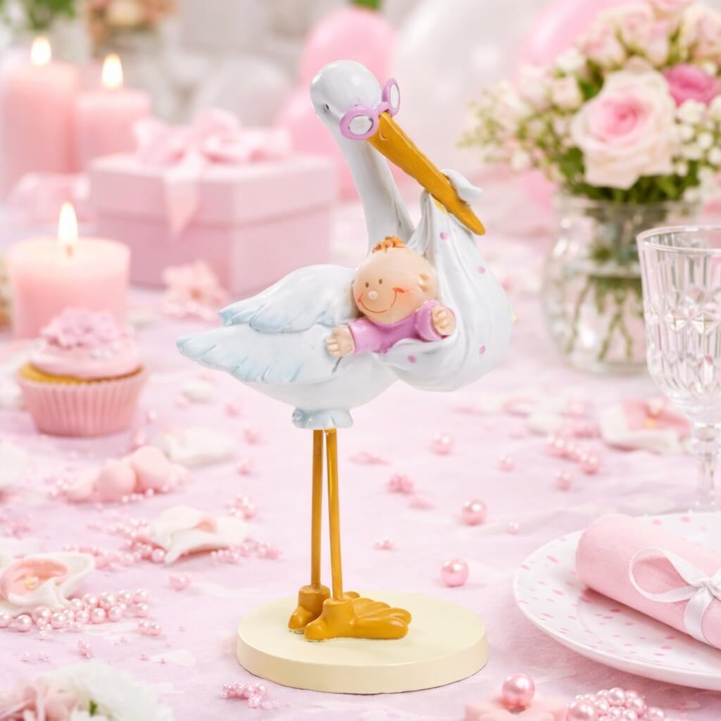 Barnedåbspynt stork med baby pige – perfekt bordpynt