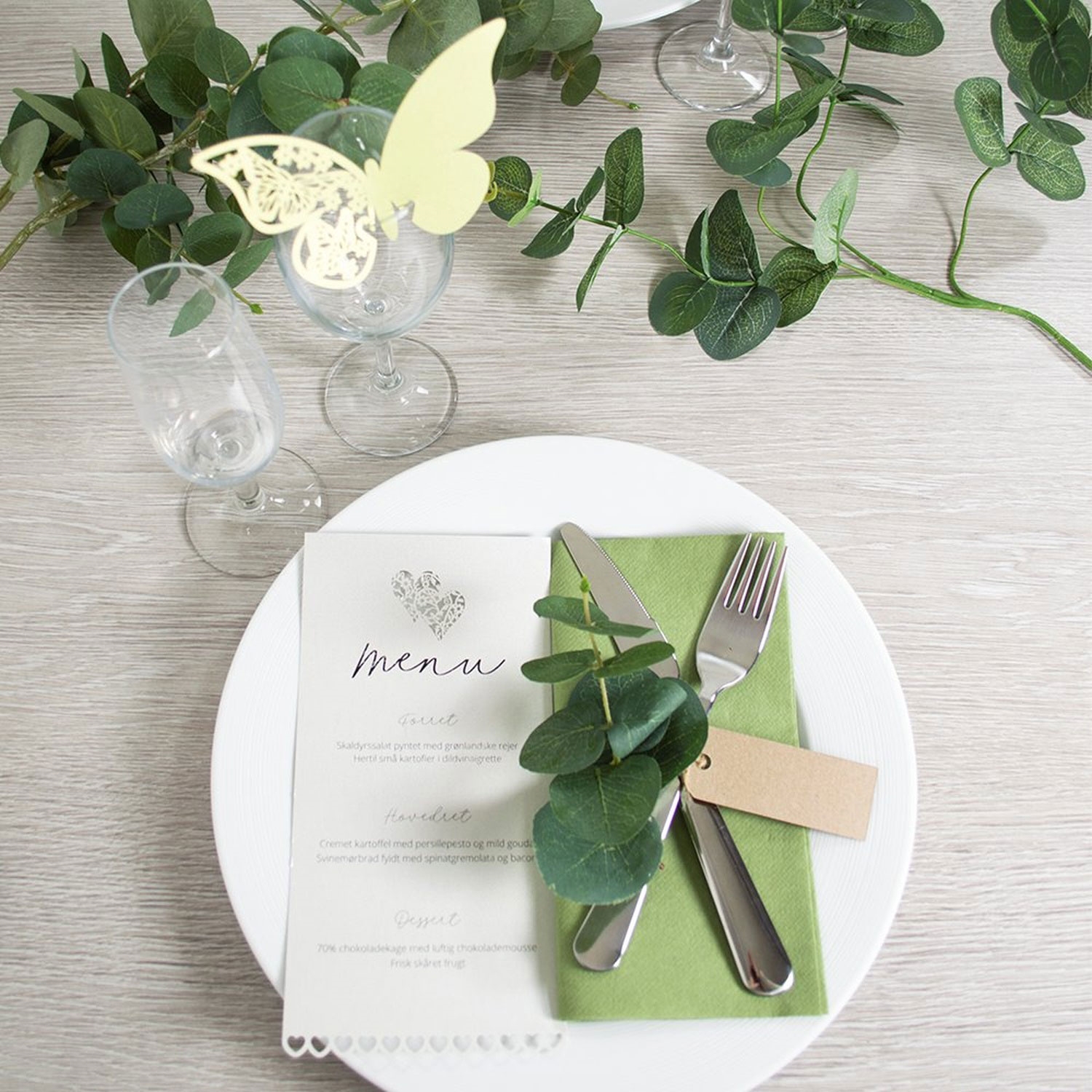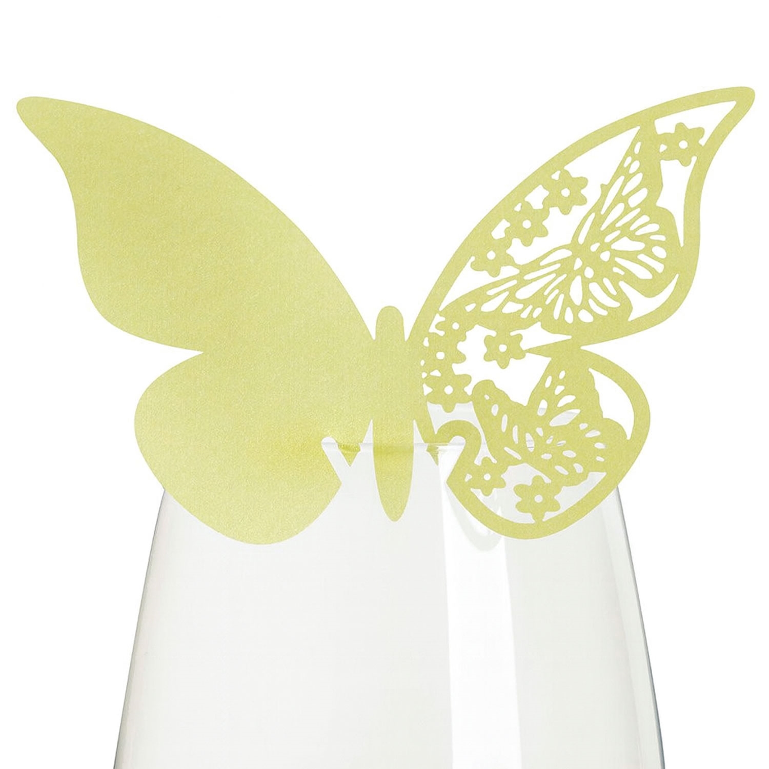 Den er slet ikke til at stå for denne limegrønne sommerfugl, der sidder på kanten af glasset. Lige klar til at lette og flyve sin vej. Men den gør det heldigvis ikke, det ville blive et frygteligt rod, når dine gæster skal finde deres pladser. For sommerfuglen skal nemlig bruges som bordkort. Bestil dem i dag, og vis din gæster deres plads ved bordet.