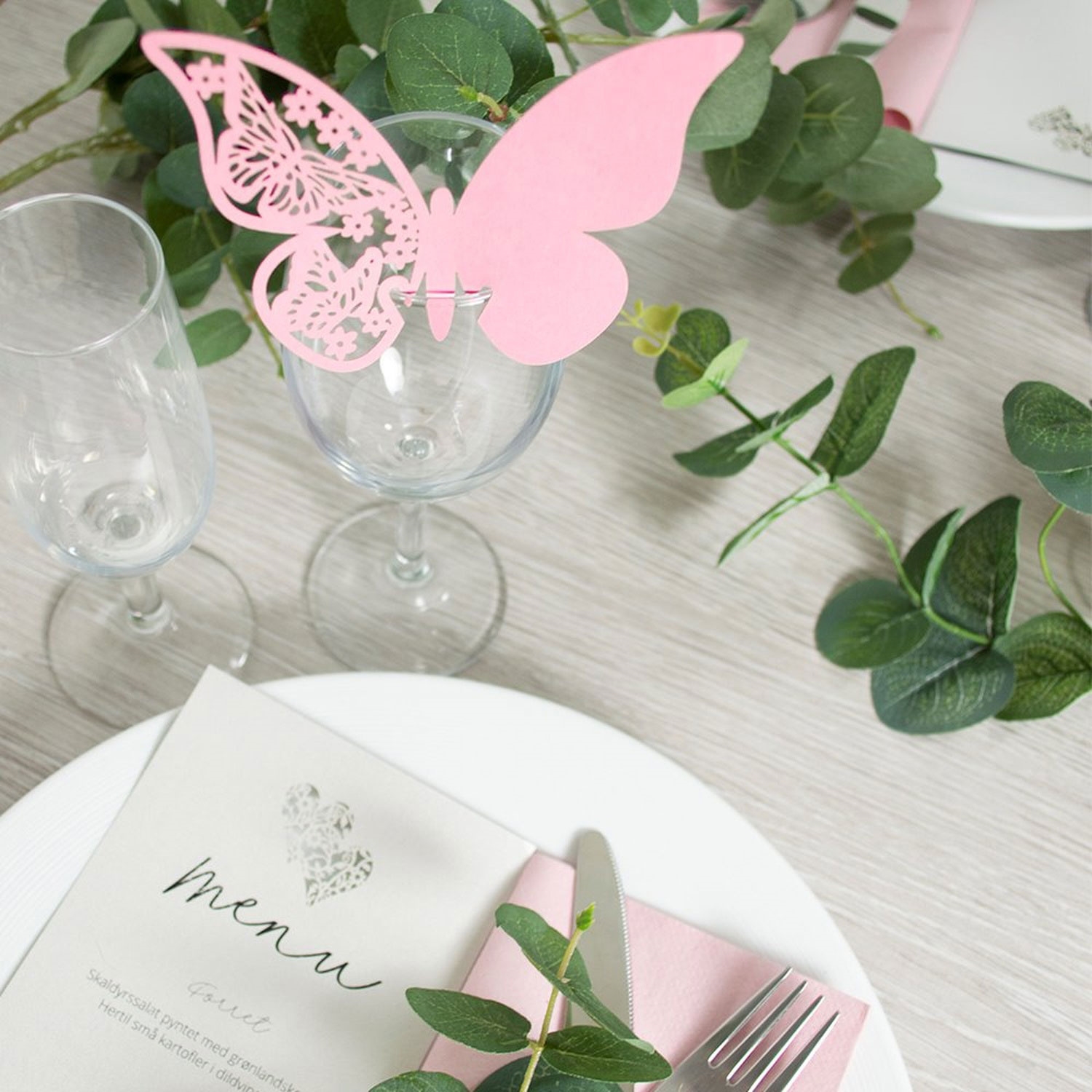 Dit festbord vil komme til at ligne en flot have med sommerfugle flaksende rundt, når disse søde bordkort med lyserøde sommerfugle først er placeret – én ved hver kuvert. Populære til alt fra barnedåb og konfirmation til bryllup.