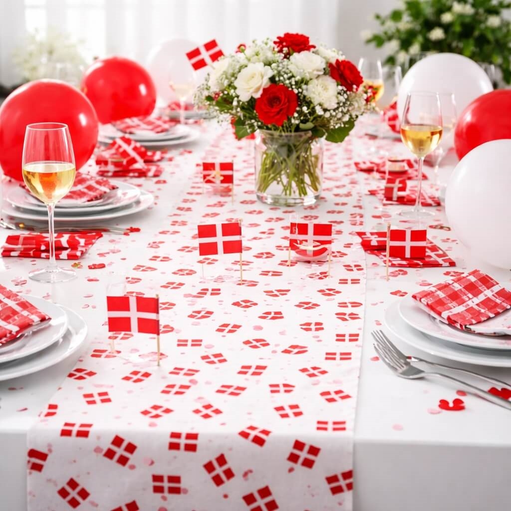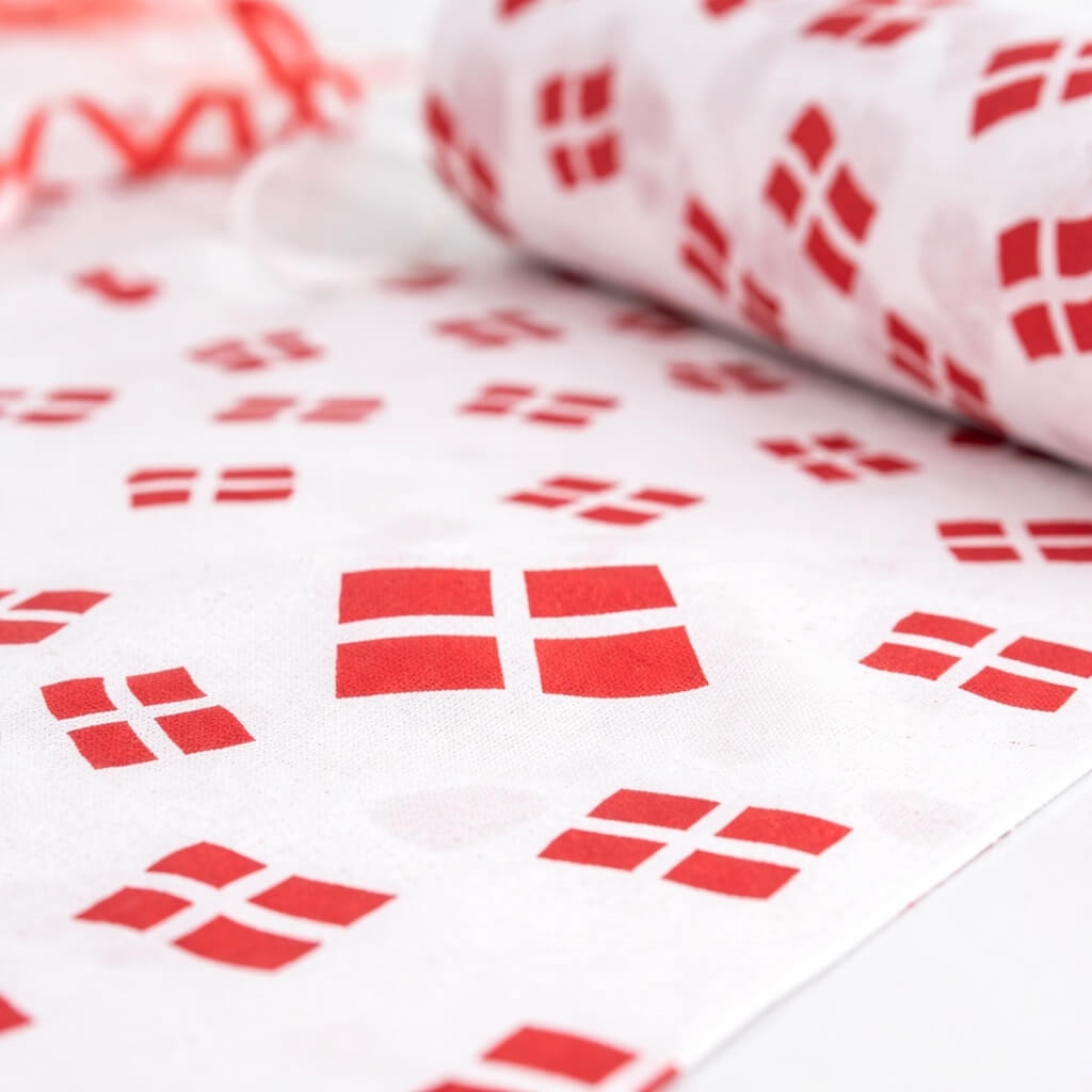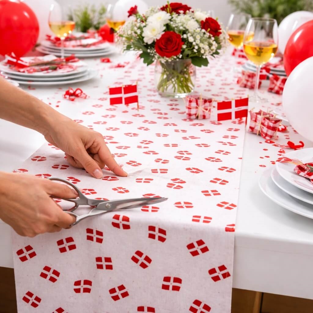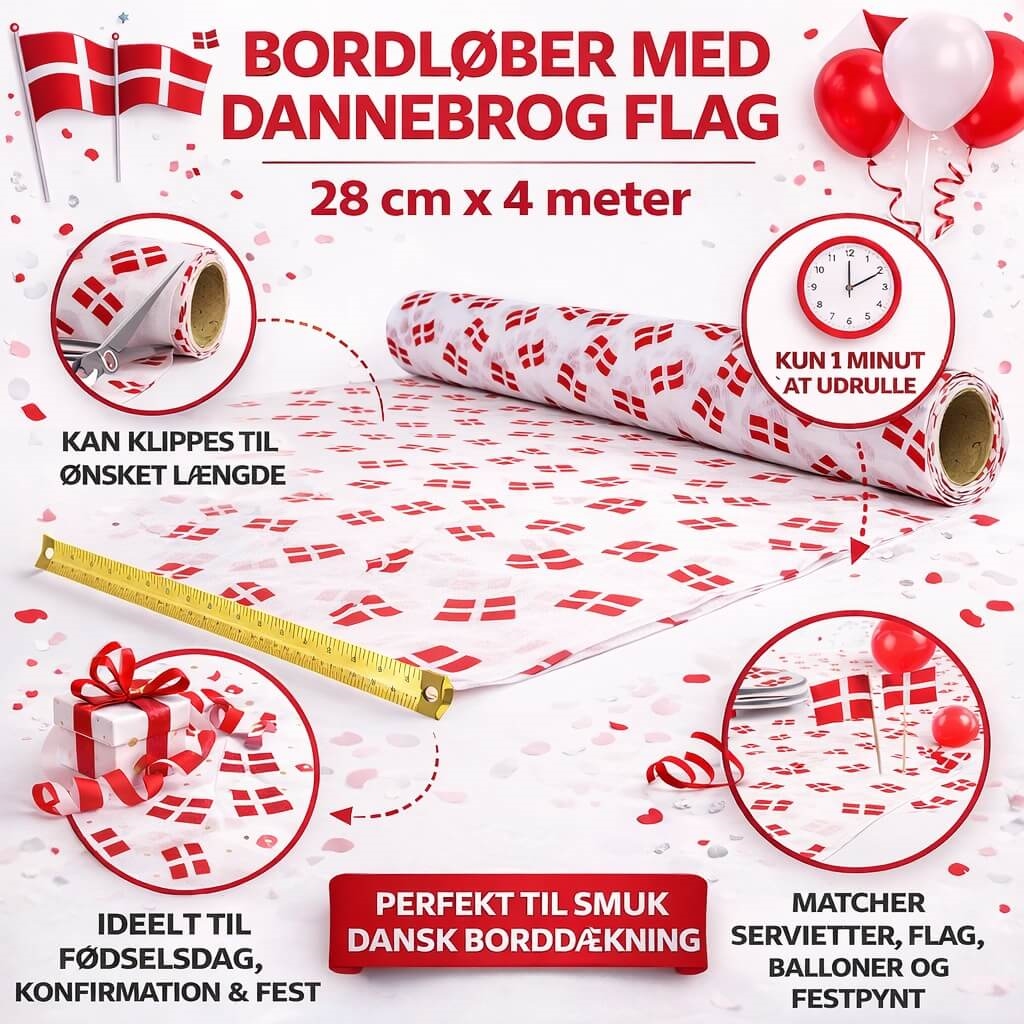 Denne bordløber med Dannebrog flag 28 cm x 4 m er den hurtigste måde at skabe en flot dansk borddækning, uanset om det er fødselsdag, konfirmation eller studentergilde.