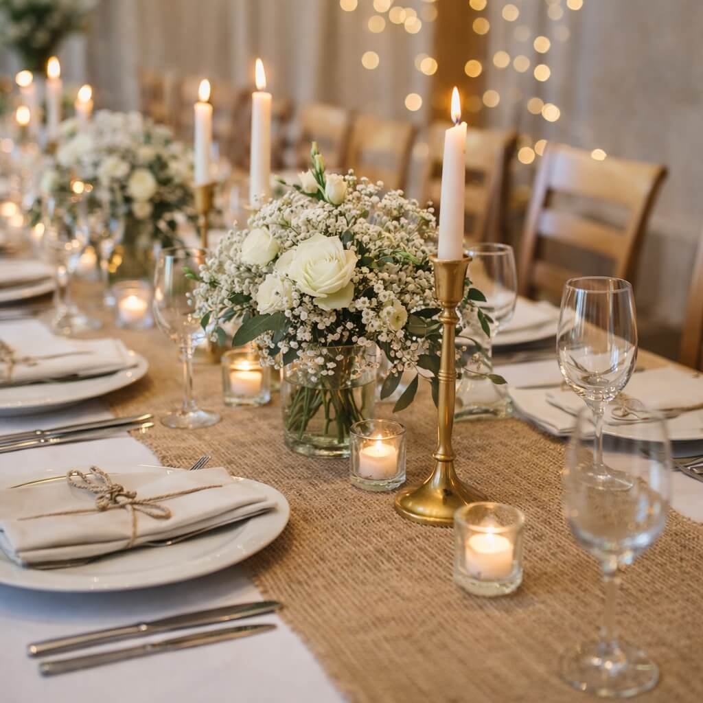 Bordløber Decojute natur 30cm x 5m borddækningBordløber Decojute natur 30cm x 5m festpyntPyntet festbord med Decojute bordløber i natur, hvide blomster og levende lys til bryllup og fest