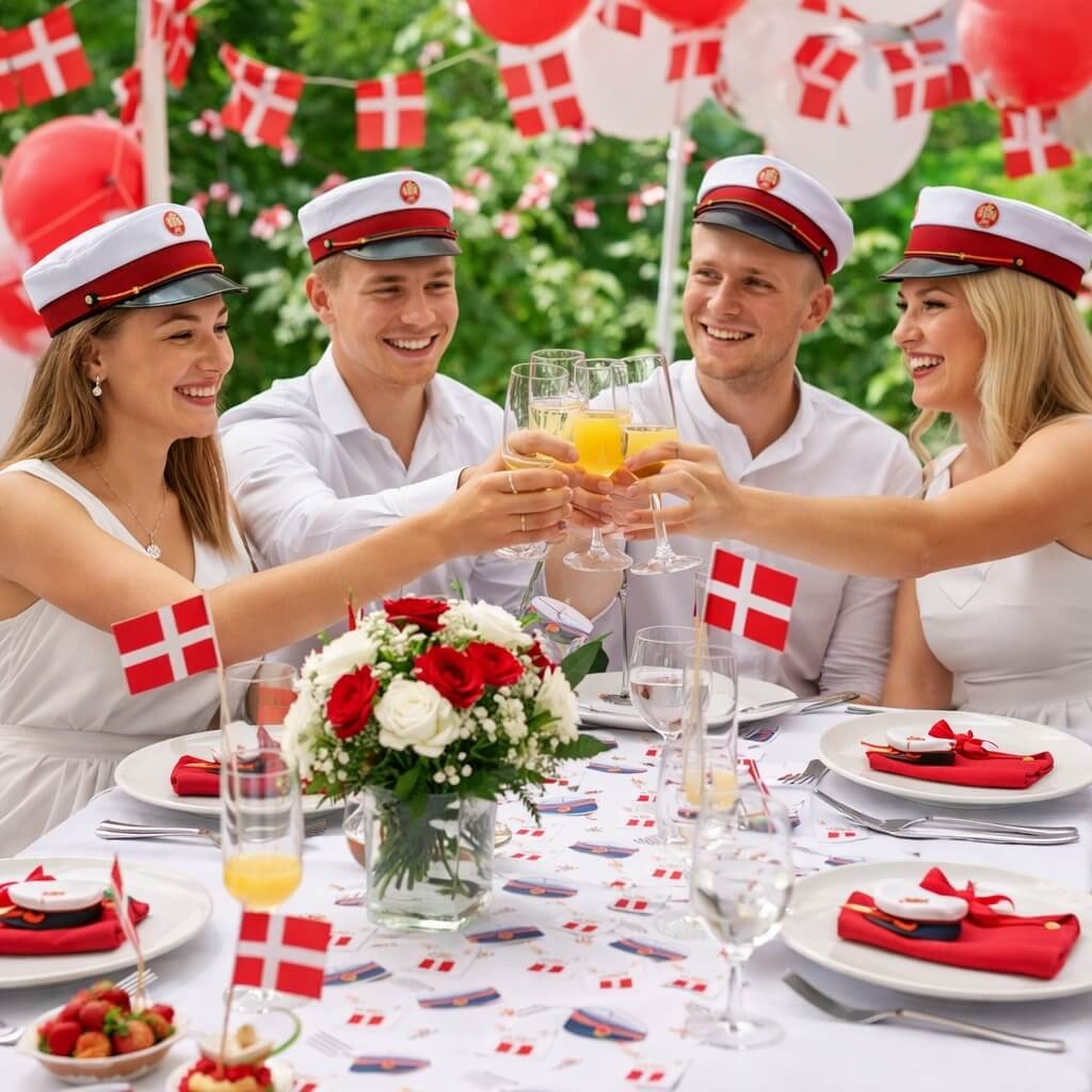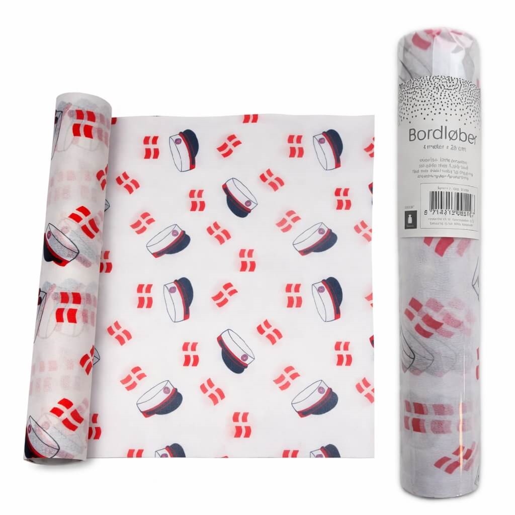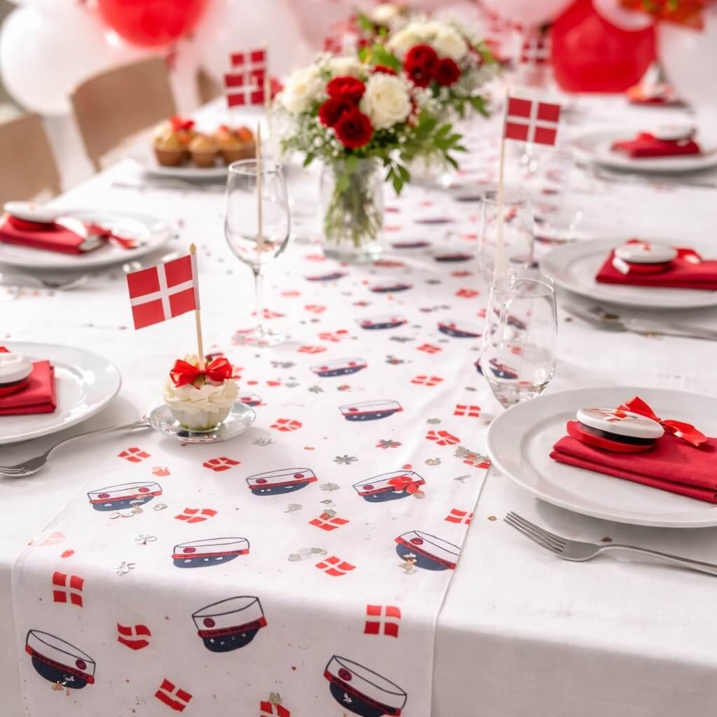 Festbord pyntet til studenterfest med rød bordløber, danske flag og studenterhuerBordløber i studentertema med danske flag og studenterhuer – rød og hvid bordløber 28 cm x 4 meterStudenter fejrer studenterfest ved festbord pyntet med rød bordløber, danske flag og studenterpynt