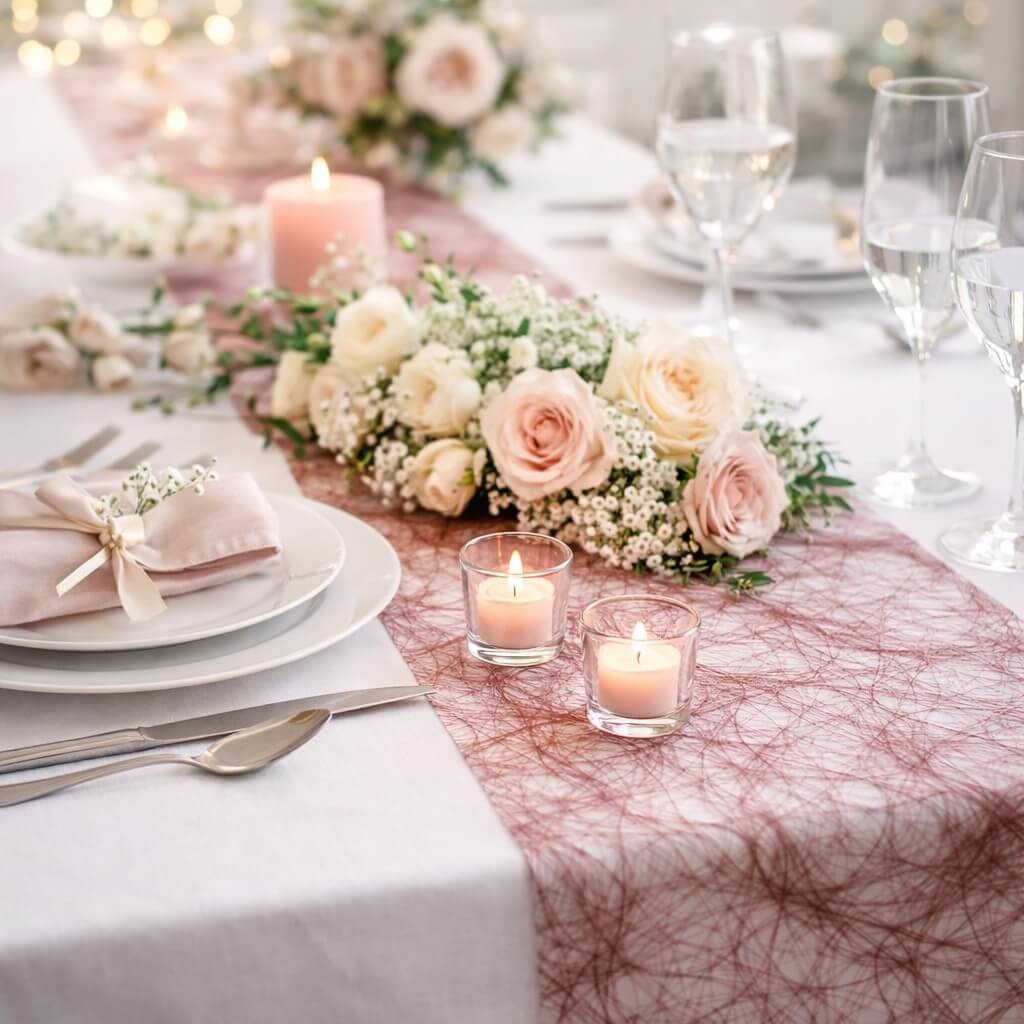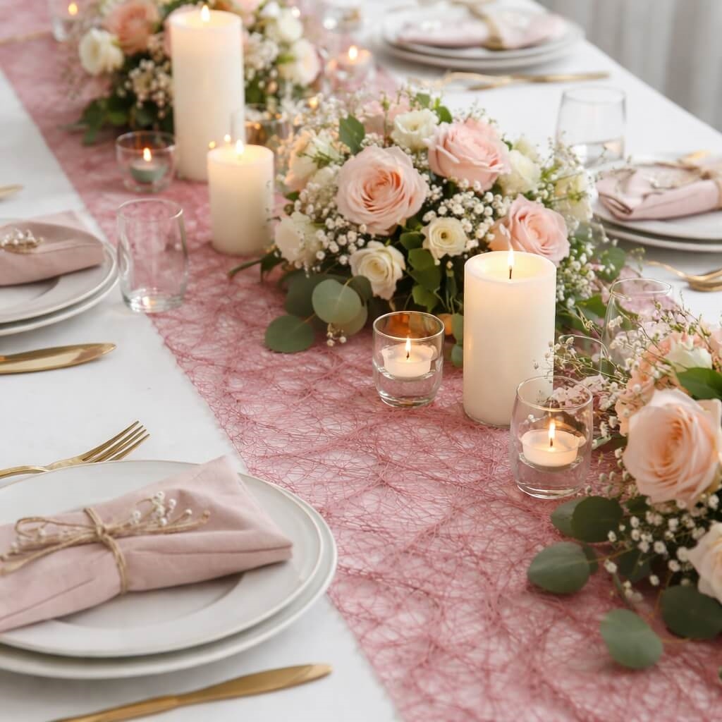Festbord pyntet med Sizoweb bordløber i gammelrosa, blomster og lys til bryllupPyntet festbord med Sizoweb bordløber i gammelrosa, blomster og stearinlysBordløber Sizoweb gammelrosa 30cm x 25m. festartikler
