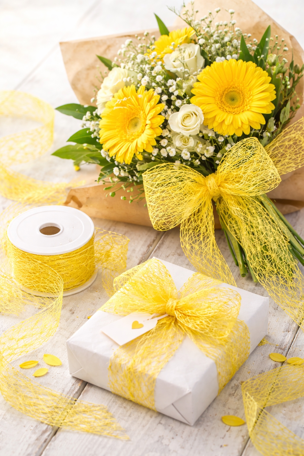 Med en bredde på 30 mm og en længde på 10 meter er dette bånd ideelt til både private og professionelle formål. Den fine gule farve passer perfekt til  moderne og formelle anledninger som gaveindpakning, bryllupper, konfirmationer, firmaevents og blomsterdekorationer.