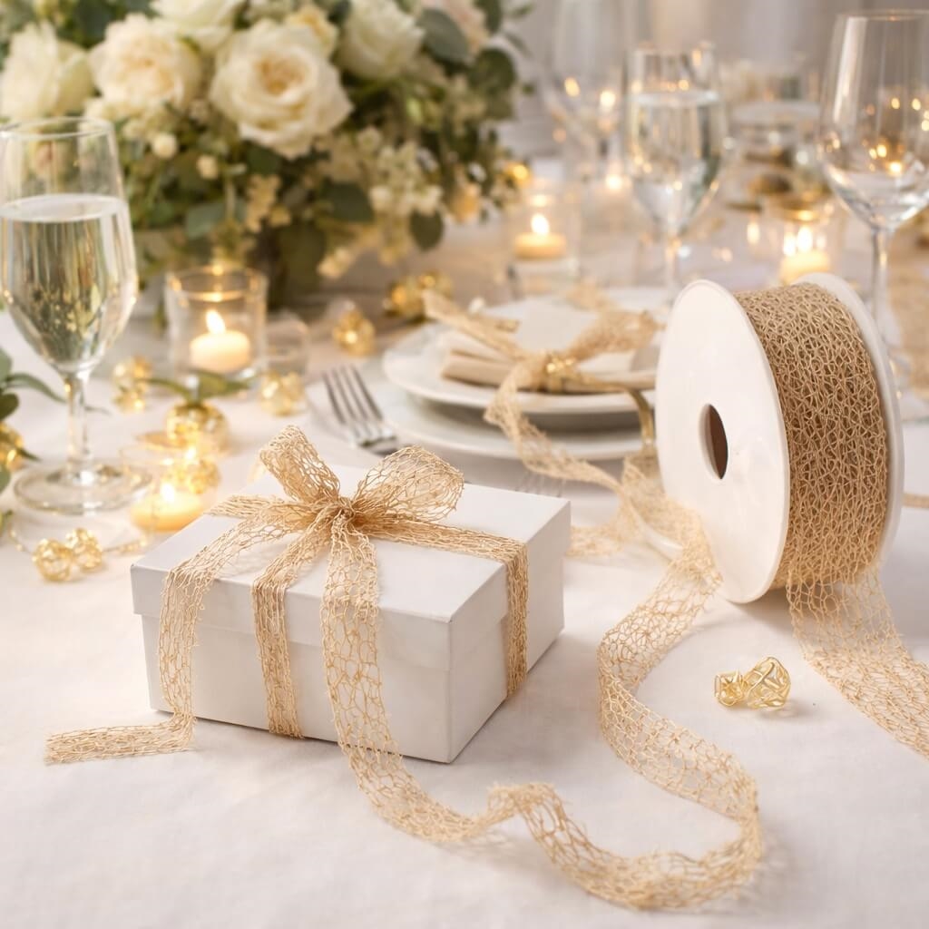 Crispy Deluxe bånd i guld brugt til gaveindpakning på festligt pyntet bord med lys og blomsterCrispy Deluxe bånd i guld 30 mm x 10 m – dekorativt gavebånd på rulleCrispy Deluxe bånd i guld brugt til gaveindpakning på elegant festbord med blomster og lys
