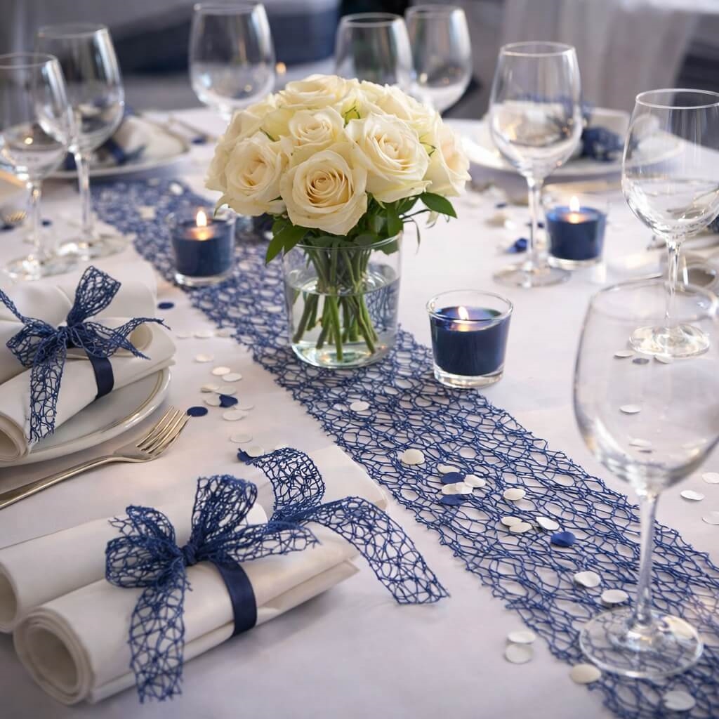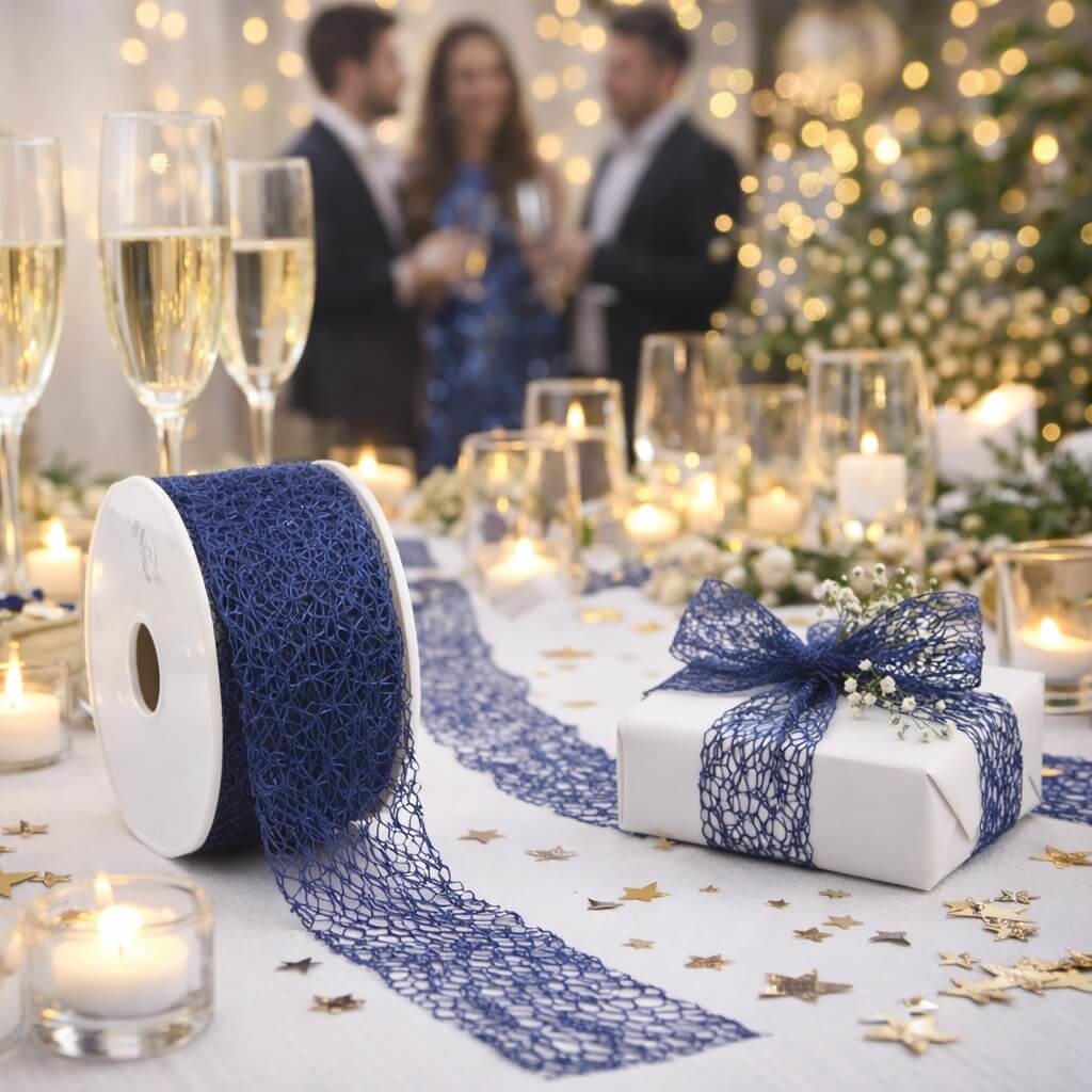 Festbord dækket med Crispy Deluxe bånd i marineblå som bordløber og servietsløjferMarineblåt Crispy Deluxe dekorationsbånd i 30 mm bredde på rulle – 10 meterFestbord dækket med Crispy Deluxe bånd i marineblå som bordløber og servietsløjferFestligt dækket bord med Crispy Deluxe bånd i marineblå brugt til gaveindpakning og borddekoration