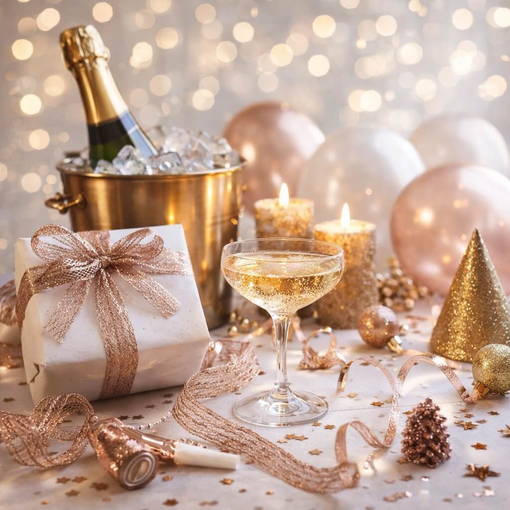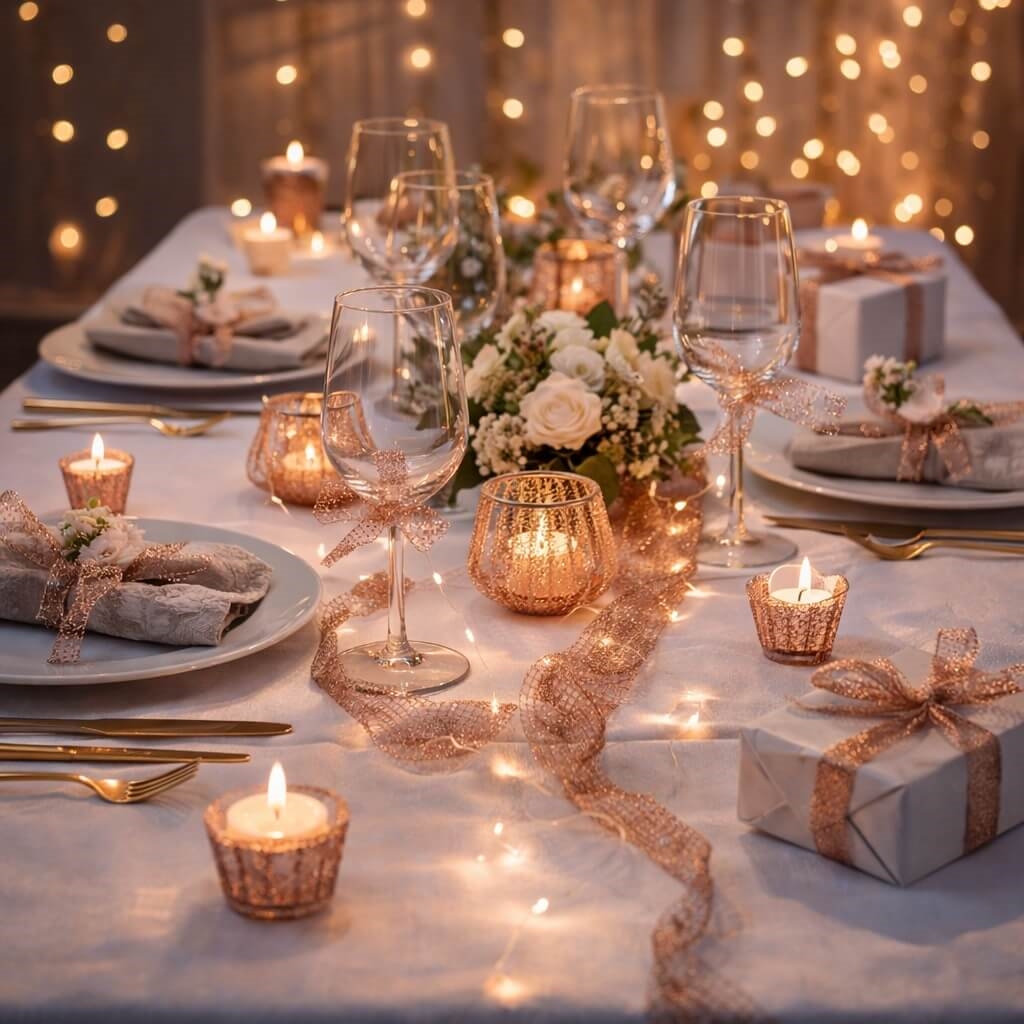 Festlig borddekoration med Crispy Deluxe kobberbånd, champagne og gaveindpakningCrispy Deluxe kobberbånd 30 mm x 10 m med crispy struktur til dekoration og gaveindpakningKreativ dekoration med Crispy Deluxe kobberbånd brugt til gaveindpakning og blomsterkransElegant festbord dekoreret med Crispy Deluxe kobberbånd, lys og blomster