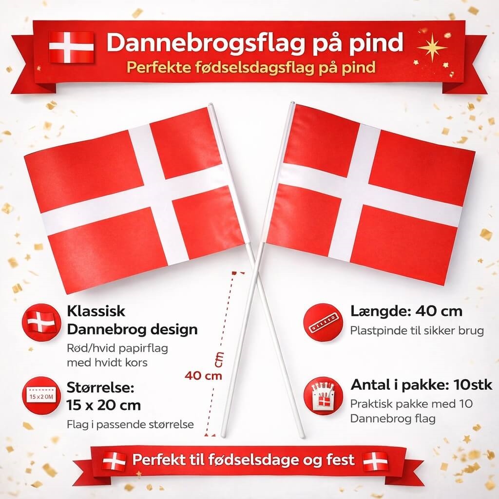 Dannebrogsflag på pind 40 cm 10 stk – klassiske fødselsdagsflag på pind i rød og hvidDannebrogsflag på pind i glas til borddækning – fødselsdagsflag til dansk fest og pyntBørn til fødselsdag med Dannebrogsflag på pind – fødselsdagsflag til fest, bordpynt og dansk fejringClose-up af Dannebrogsflag på pind i papir – fødselsdagsflag med hvid plastpindInfografik af Dannebrogsflag på pind 40 cm 10 stk – fødselsdagsflag med mål, størrelse og produktinformation