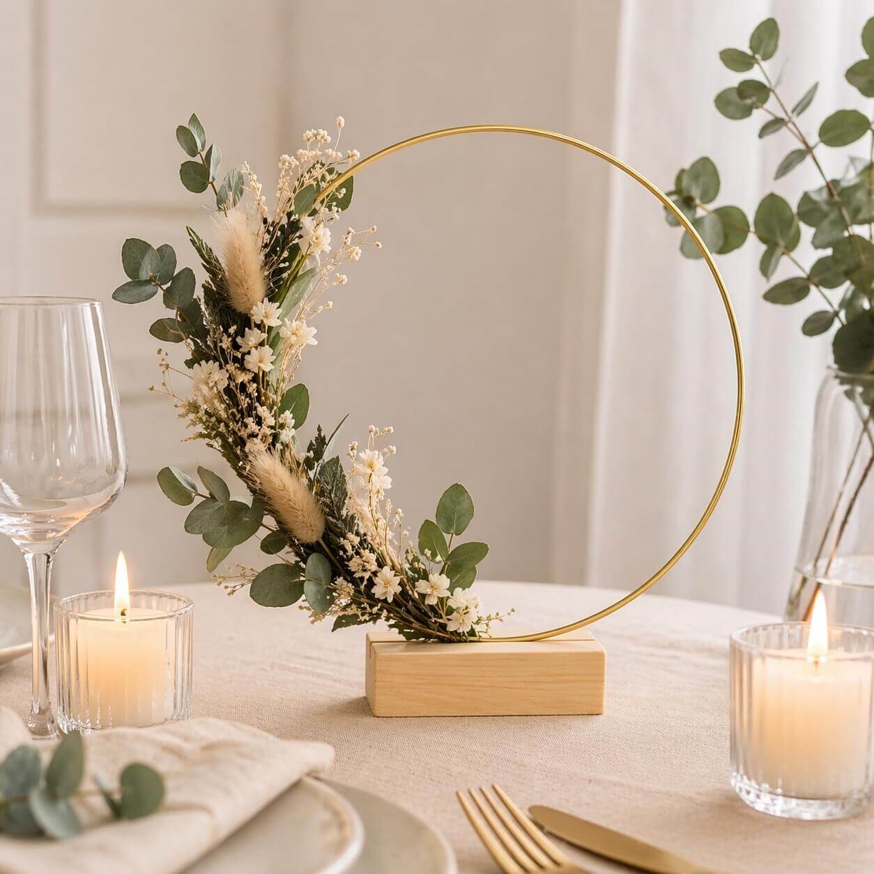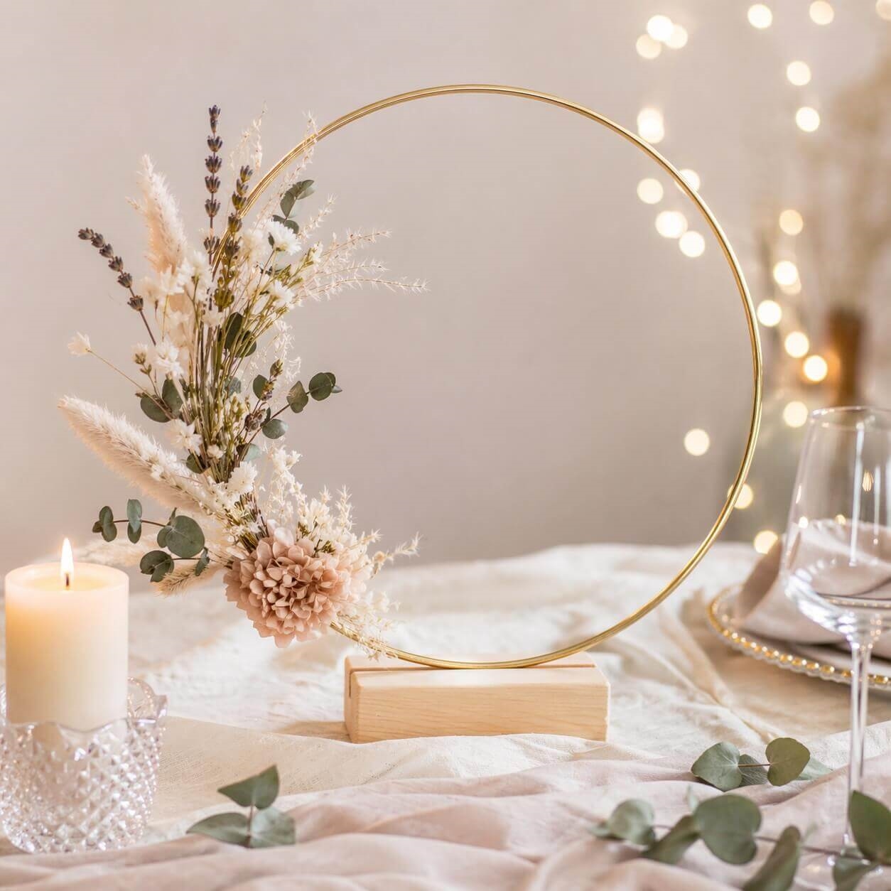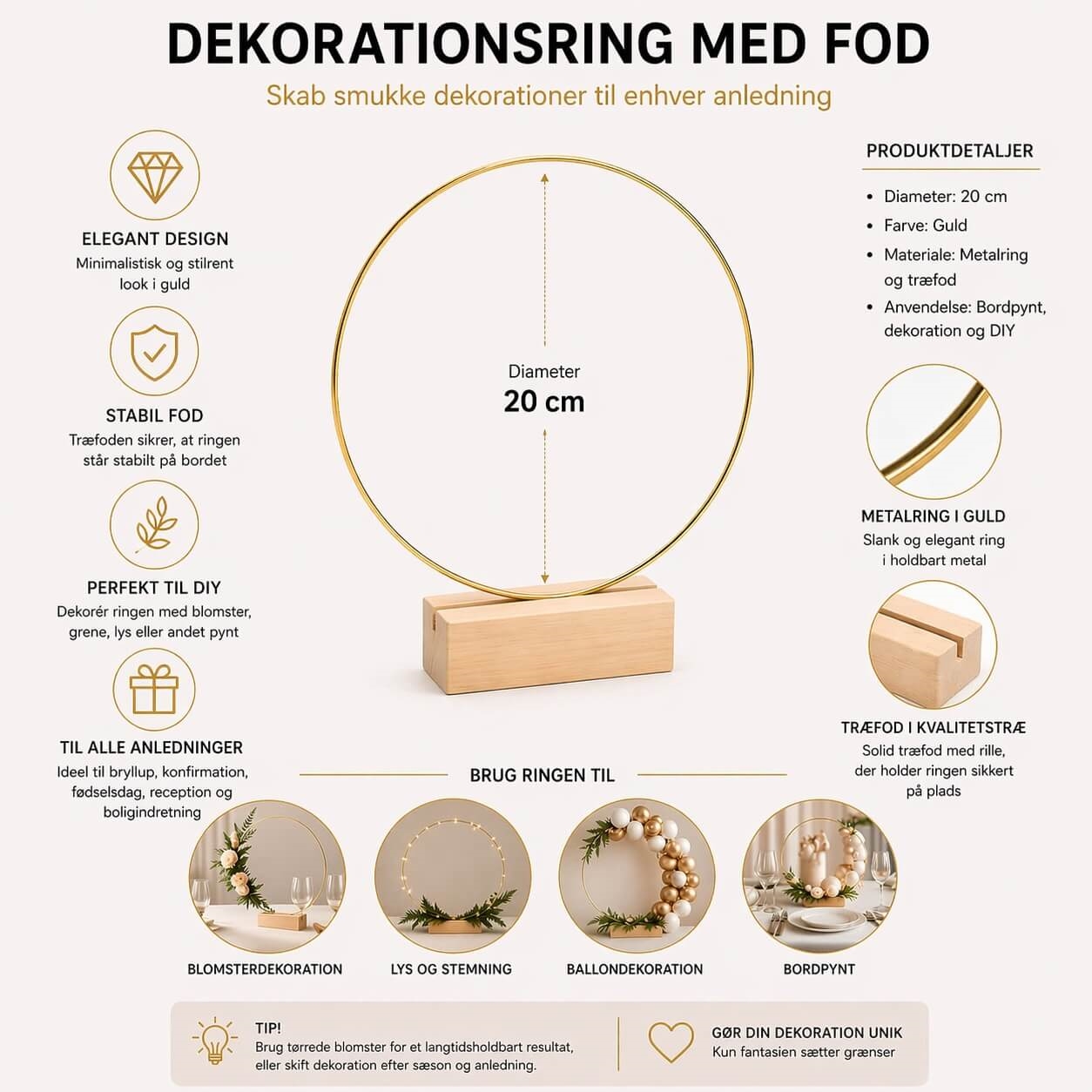 Den populære dekorationsring guld er ideel til at lave kreative opsætninger med blomster, lys og pynt, og den stabile træfod gør den nem at placere direkte på bordet.