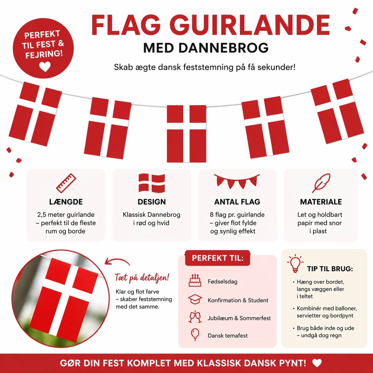 Flag guirlande med Dannebrog 2,5 meter med 8 danske flag på snor til fest og fødselsdagFlag guirlande med Dannebrog hængt over festbord med cupcakes og dekoration til fødselsdagFlag guirlande med Dannebrog hængt i træer over festbord til fødselsdag i havenClose-up af flag guirlande med Dannebrog i rød og hvid til fødselsdag og festInfografik af flag guirlande med Dannebrog 2,5 meter med information om længde, antal flag og brug til fest