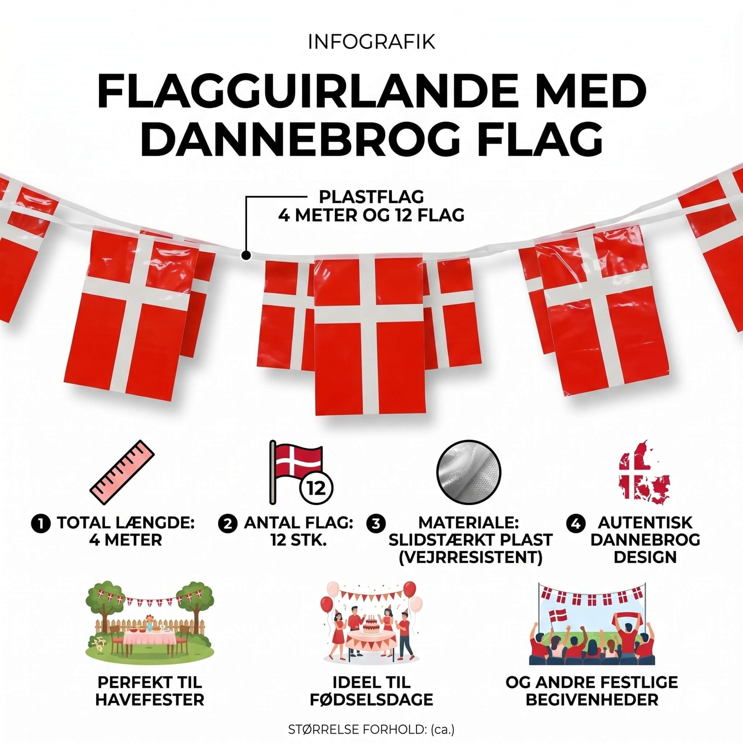 Flagguirlande med Dannebrog flag i plast 4 meter vist på hvid baggrund med klassiske røde og hvide danske flagFlagguirlande med Dannebrog flag ophængt over festbord med kage, balloner og dansk borddækning til fødselsdagFlagguirlande med Dannebrog flag hængt over festbord i have med balloner og dansk pynt til fødselsdagClose-up af Dannebrog flag på flagguirlande i plast med detaljeret overflade og ophæng til fest og fødselsdagInfografik af flagguirlande med Dannebrog flag i plast 4 meter med 12 flag, vejrbestandig og perfekt til fødselsdag og fest