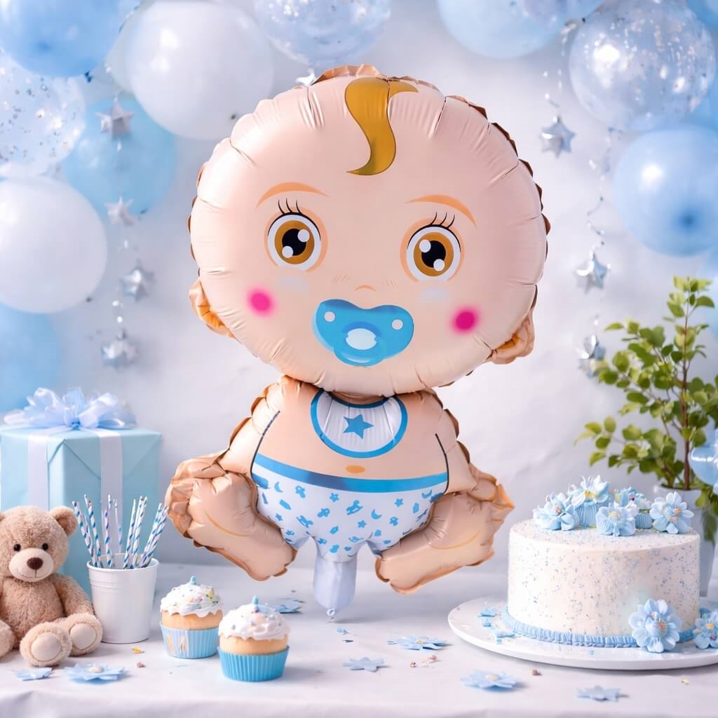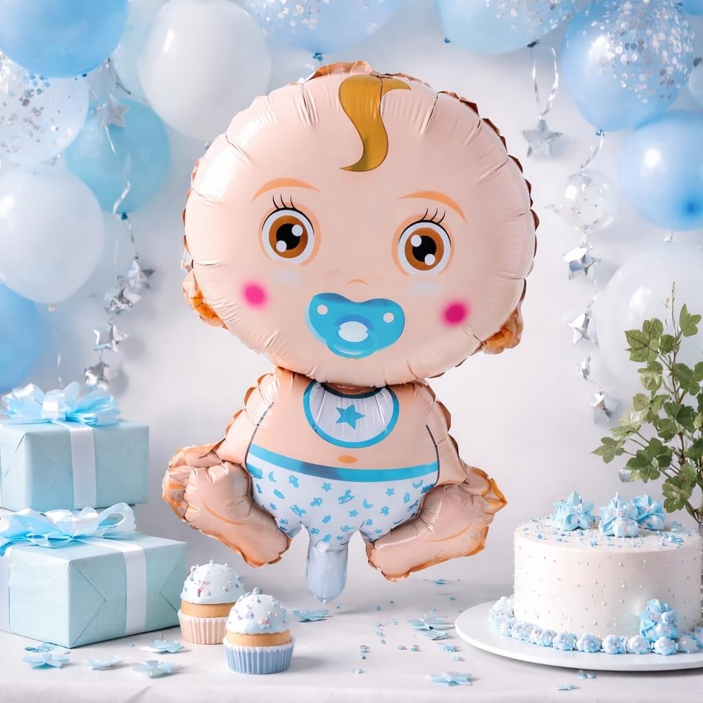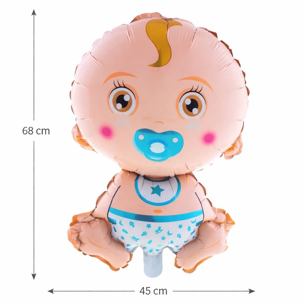 Den detaljerede babyfigur giver et varmt og festligt udtryk, som både skaber glæde og fungerer perfekt som fotobaggrund. Den lyseblå farve signalerer klassisk drengefejring og passer smukt sammen med andet baby-tema pynt, ballonguirlander eller borddekorationer.