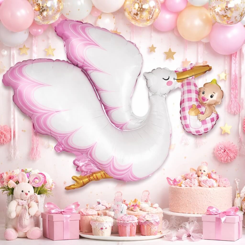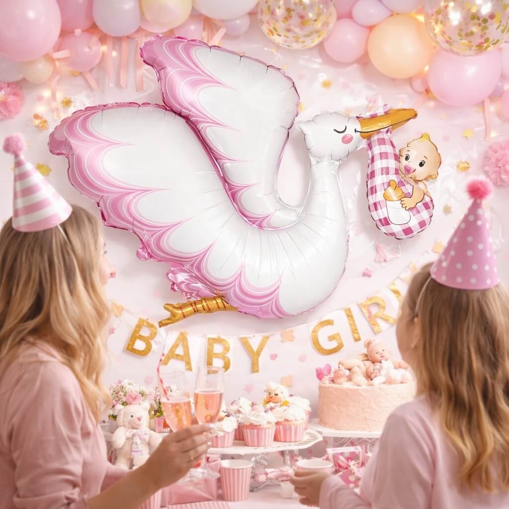 Uanset om du planlægger en hyggelig babyshower eller vil skabe en varm velkomst til en nyfødt pige, er denne storke-folieballon en enkel, men effektfuld dekoration, der spreder glæde og feststemning.