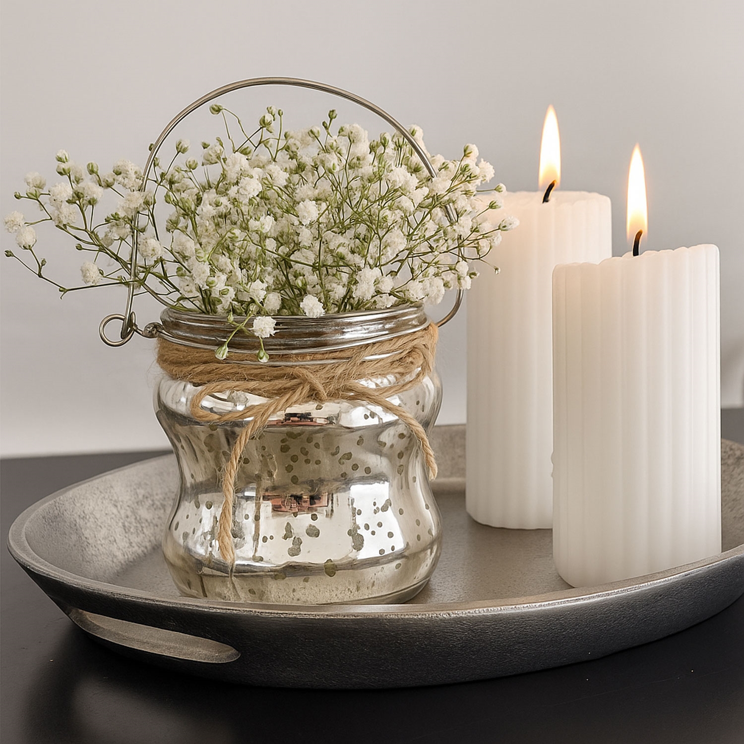 Denne rustik fyrfadsstage med hank i antikt sølv fra Kija‑Design.dk bringer liv og varme til borddækningen ved enhver festlig lejlighed. Fremstillet i glas med et fattigmandssølv‑finish og med praktisk hank, så den både kan stå på bordet eller hænges op. Den perfekte kombination af dekorativ bordpynt og funktionelt lys, ideel til bryllup, sølvbryllup, konfirmation, barnedåb, fødselsdag og jul.