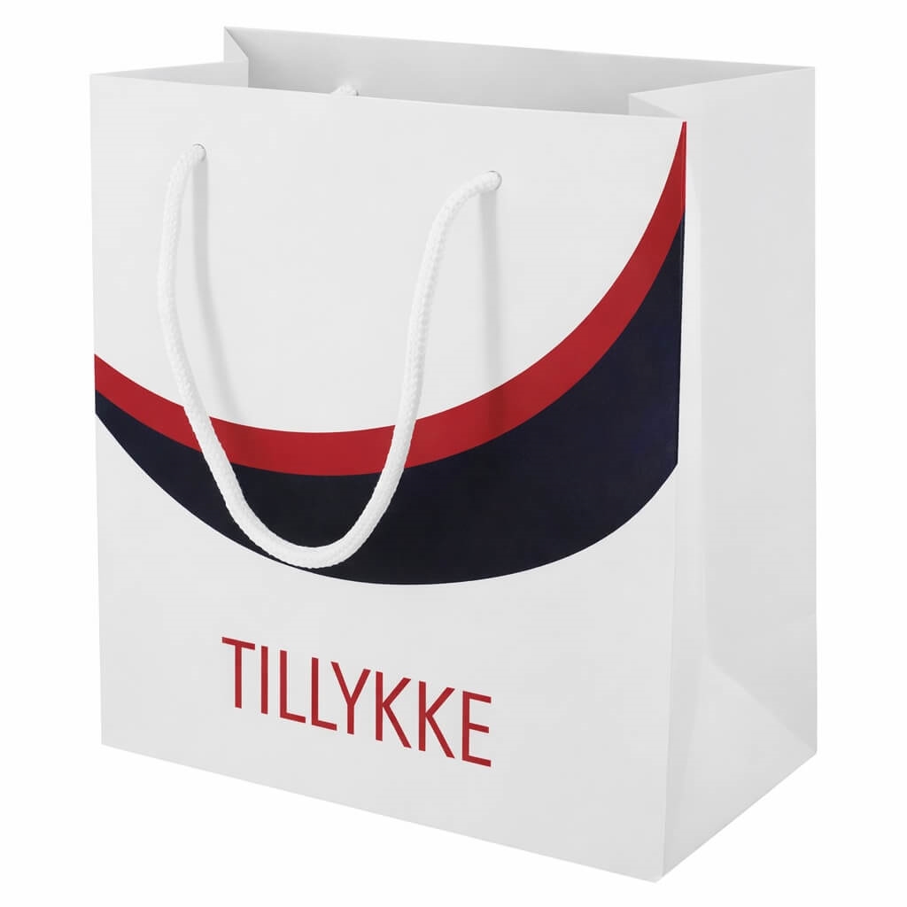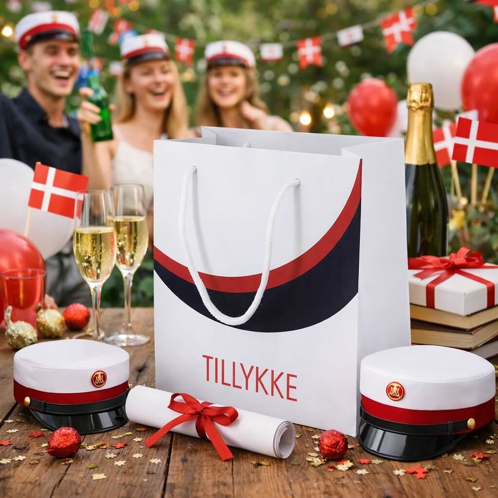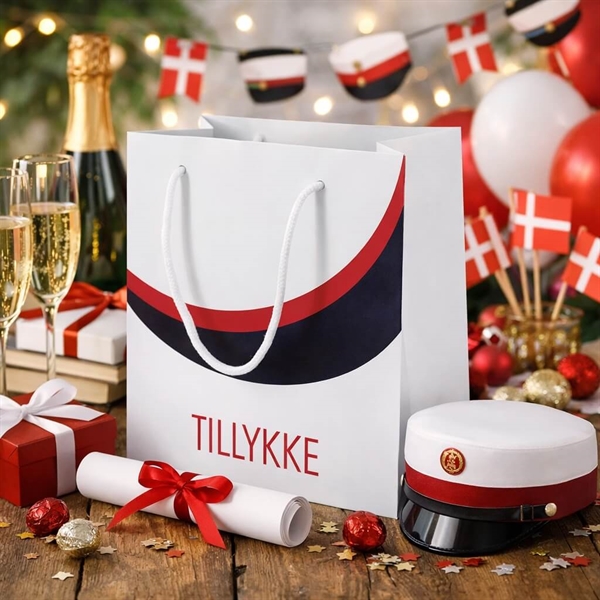 Rød student gavepose med teksten Tillykke omgivet af studenterhuer, champagne, gaver og danske flag ved studenterfestRød student gavepose med teksten Tillykke placeret på bord til studenterfest med studenterhuer, champagne og danske flagRød student gavepose med teksten Tillykke i størrelsen 22,5 x 18 x 10,5 cm på hvid baggrund
