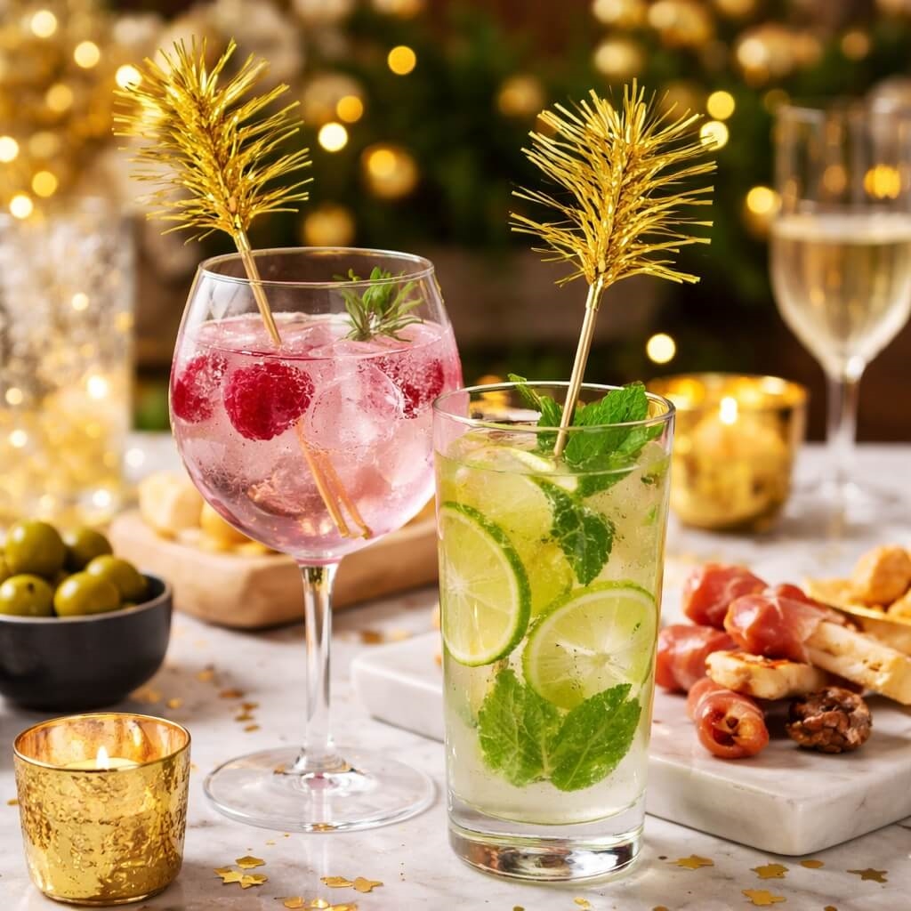 Guld folie drinks pyntepinde 10 cm pakke med 20 stk til cocktails og festCocktails pyntet med guld folie drinks pyntepinde på festligt bord med lys og snacksFestligt buffetbord med cocktails pyntet med guld folie drinks pyntepinde og snacksCocktails med guld folie drinks pyntepinde på festligt bord med lys og snacks
