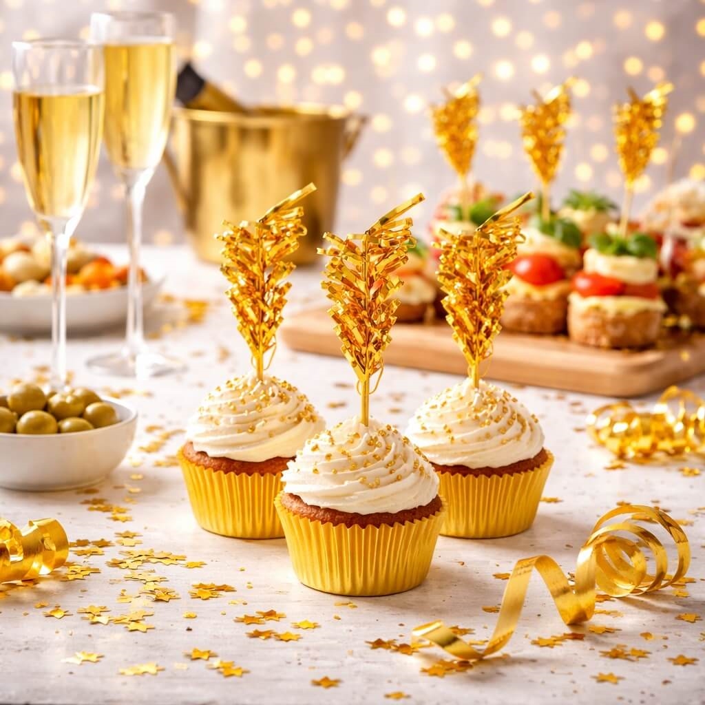 Guld folie drinks pyntepinde 10,5 cm vist i drinks og samlet som produktbillede på hvid baggrundCupcakes med hvid frosting pyntet med guld folie pyntesticks på festligt dessertbordFestlige cupcakes med hvid frosting pyntet med guld folie pyntesticks på elegant dessertbordFestlig buffet med cupcakes og tapas pyntet med guld folie pyntesticks samt champagne og guldbordpynt