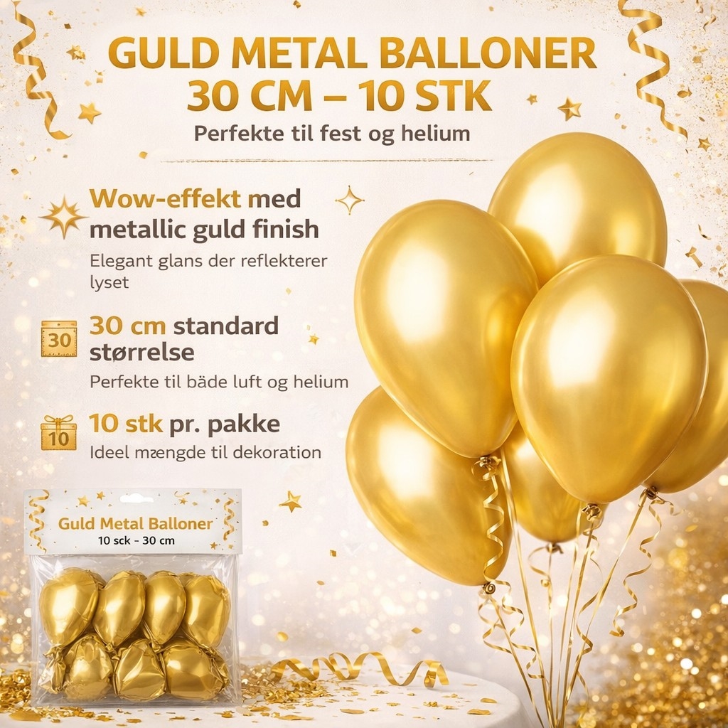 Skab en festlig og flot stemning med guld metallic balloner 30 cm. Disse klassiske latex balloner er ideelle til både børnefødselsdag, babyshower, konfirmation og temafester, hvor du ønsker en gennemført dekoration.