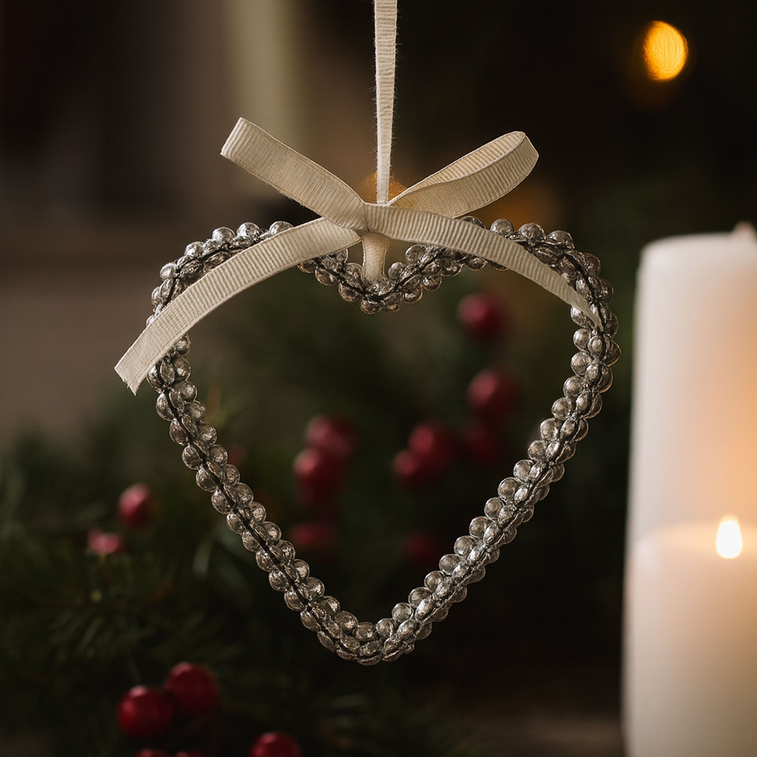 Dette hjerte er lavet af små søde klokker, som har den fineste klang. Rigtig sød at bruge til bryllup - eventuelt med en blondesløjfe bundet på - eller i boligindretningen derhjemme. Eller læg den som dekoration på et fad med fyrfadsstager, bloklys, hjertekrystaller eller hjertekonfetti.