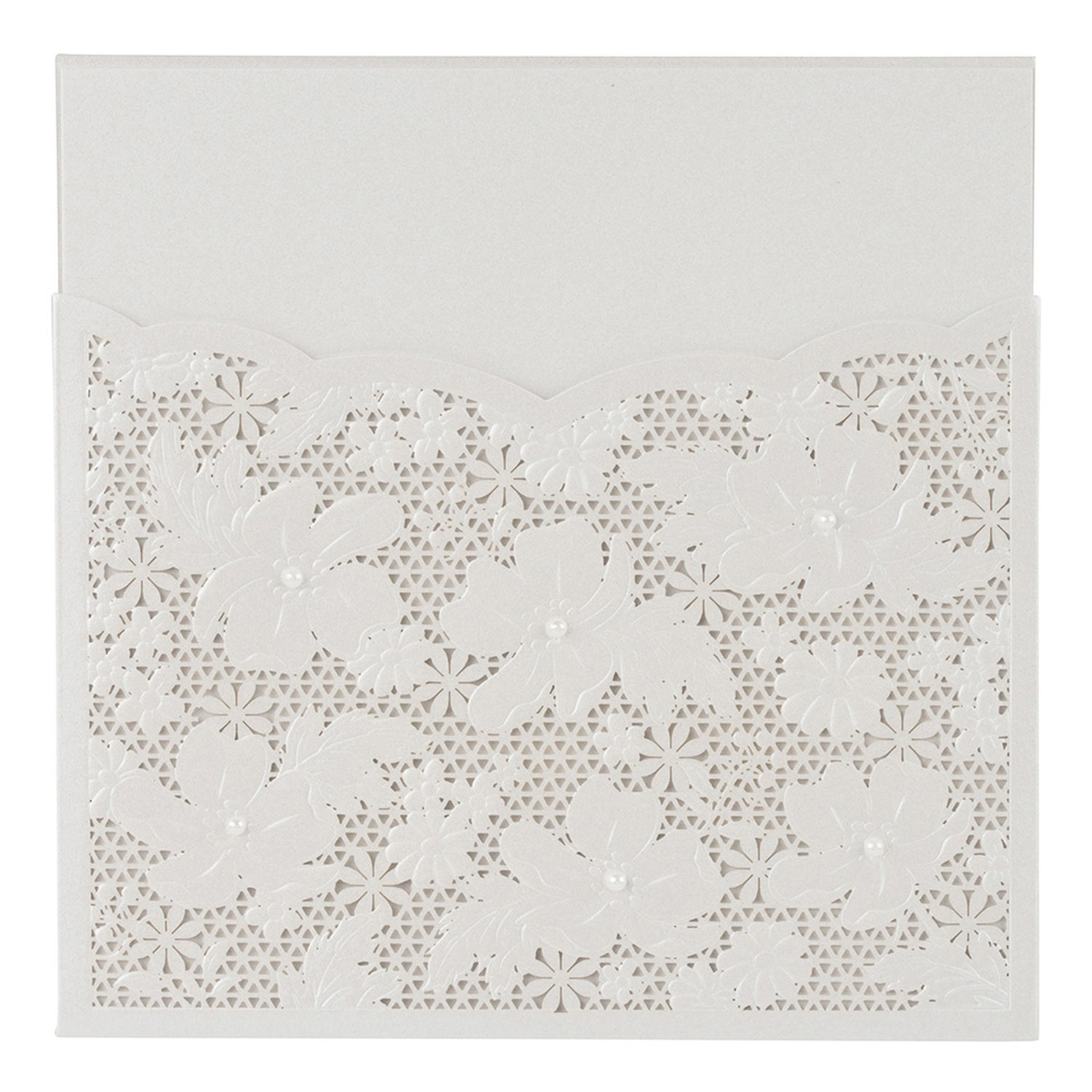 Inviter gæsterne til konfirmation, bryllup eller en anden stor begivenhed med denne smukke indbydelse. Den er i tre dele – 1 indlægsark, 1 omslag og 1 kuvert. Alle dele er hvide med et eksklusivt skinnende perlemorsskær.