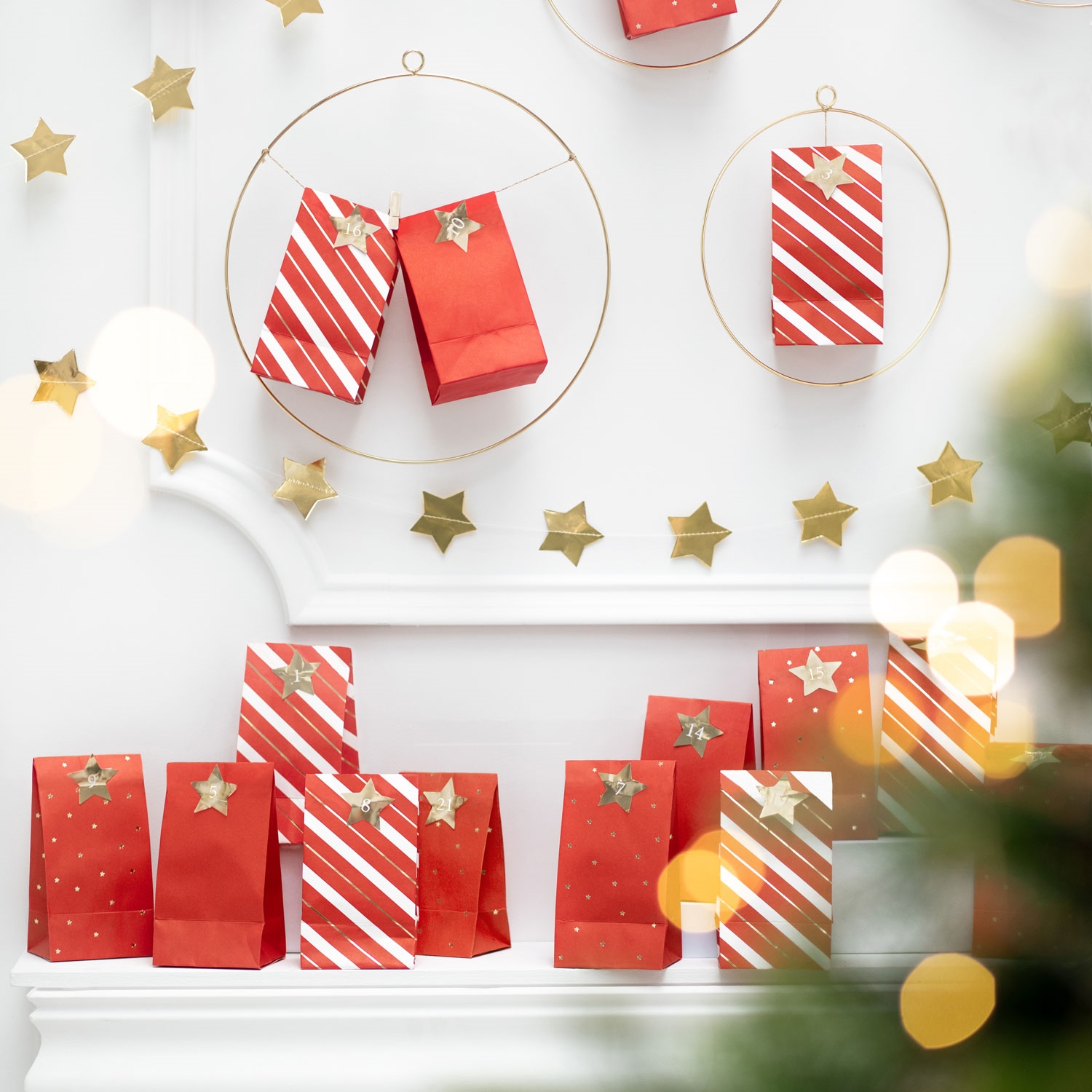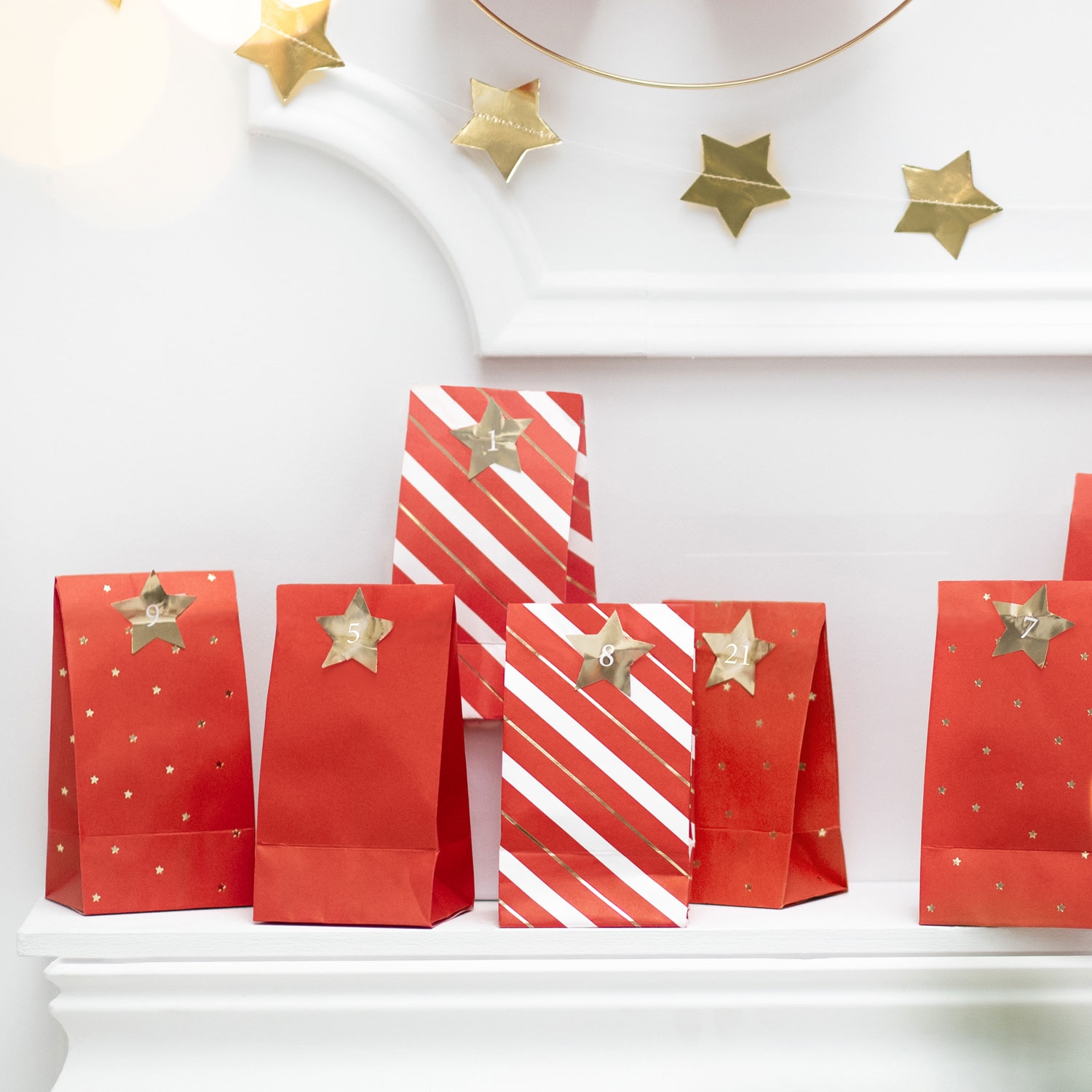 Der er selvfølgelig 24 julekalender-poser i pakken. De har tre forskellige udtryk. En ensfarvet julerød, en stribet og en prikket. Der er også stickers med, som er stanset ud som gyldne stjerner med nr. på.