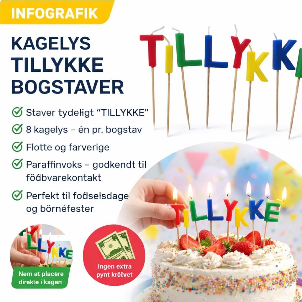 Kagelys TILLYKKE bogstaver i farver med træpinde på hvid baggrundKagelys TILLYKKE bogstaver på fødselsdagskage med jordbær, flødeskum og krymmelBarn puster kagelys TILLYKKE ud på fødselsdagskage med jordbær og flødeskumInfografik kagelys TILLYKKE bogstaver til fødselsdagskage med information og fordele