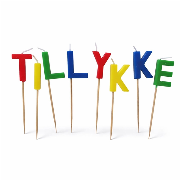 Du får 8 kagelys, der tilsammen staver “TILLYKKE”.