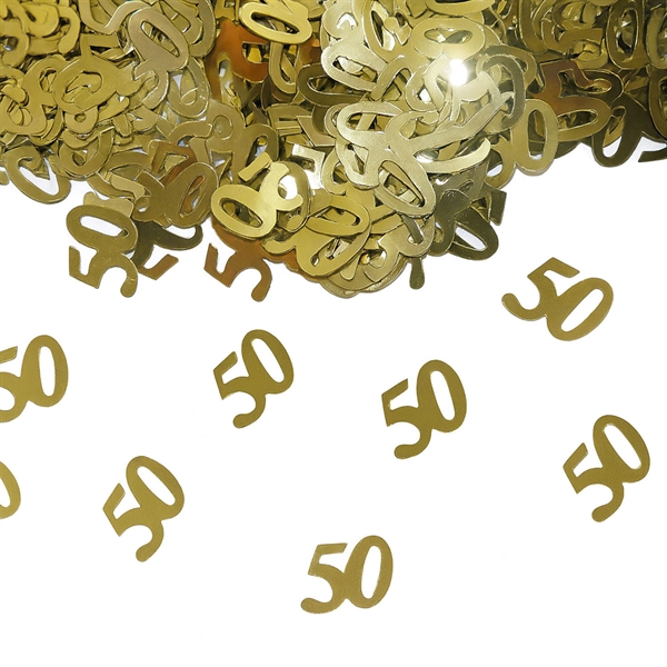Her får du festligt strøpynt til dit guldbryllup, din 50 års fødselsdag eller et 50 års jubilæum. Drys på festbordet eller pynt bordkortene og invitationerne med 50-tallene.