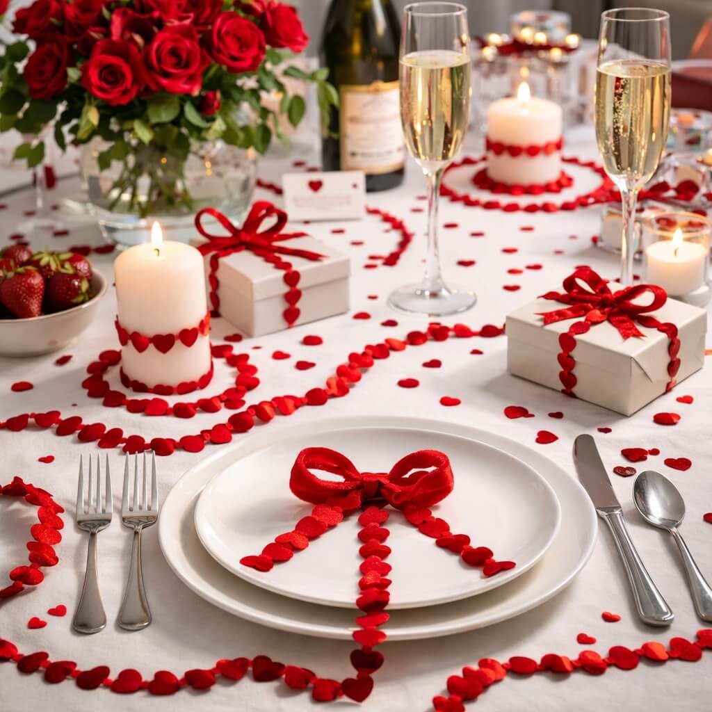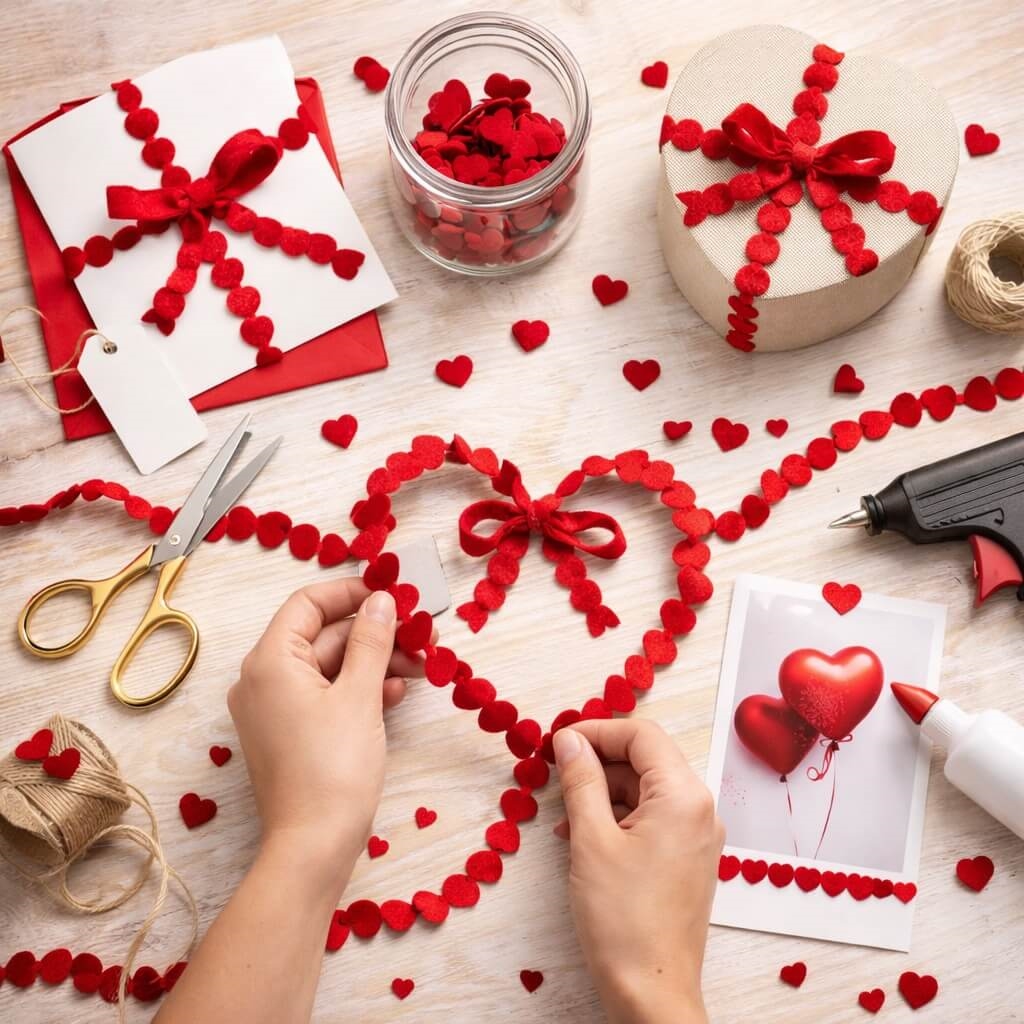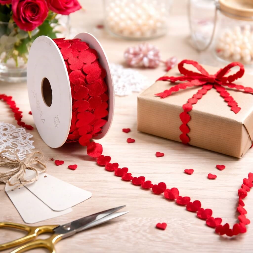 Luv hjertebånd i rød 1,5 cm x 10 m rullet på spole med hjerteformet bånd på hvid baggrundRomantisk festbord pyntet med rødt luv hjertebånd, stearinlys, gaver og blomsterKreativ DIY-dekoration med rødt luv hjertebånd brugt til hjerteform, gavepynt og hobbyprojekterRødt luv hjertebånd brugt kreativt til gaveindpakning med hjerter, gaveæske og romantisk dekoration