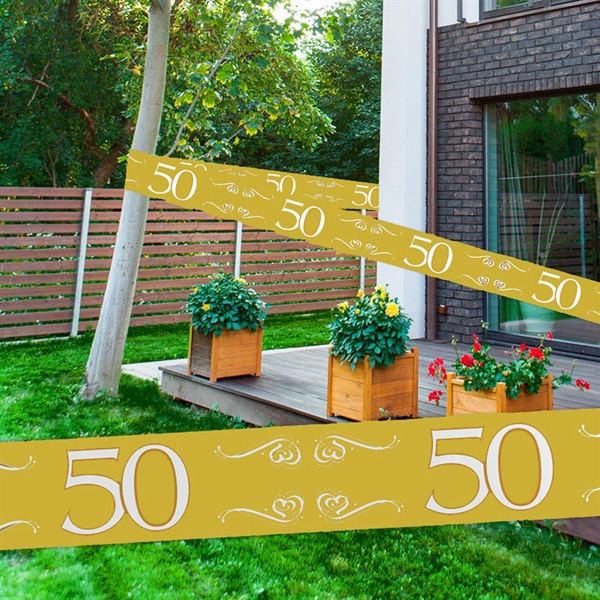 Med dette flotte skinnende markeringsbånd er man ikke i tvivl om, hvor festen afholdes. Med det 15 meter lange og 7,5 cm brede skinnende guldbånd kan du lave en fin entré til guldbrylluppet eller et 50 års-jubilæum.