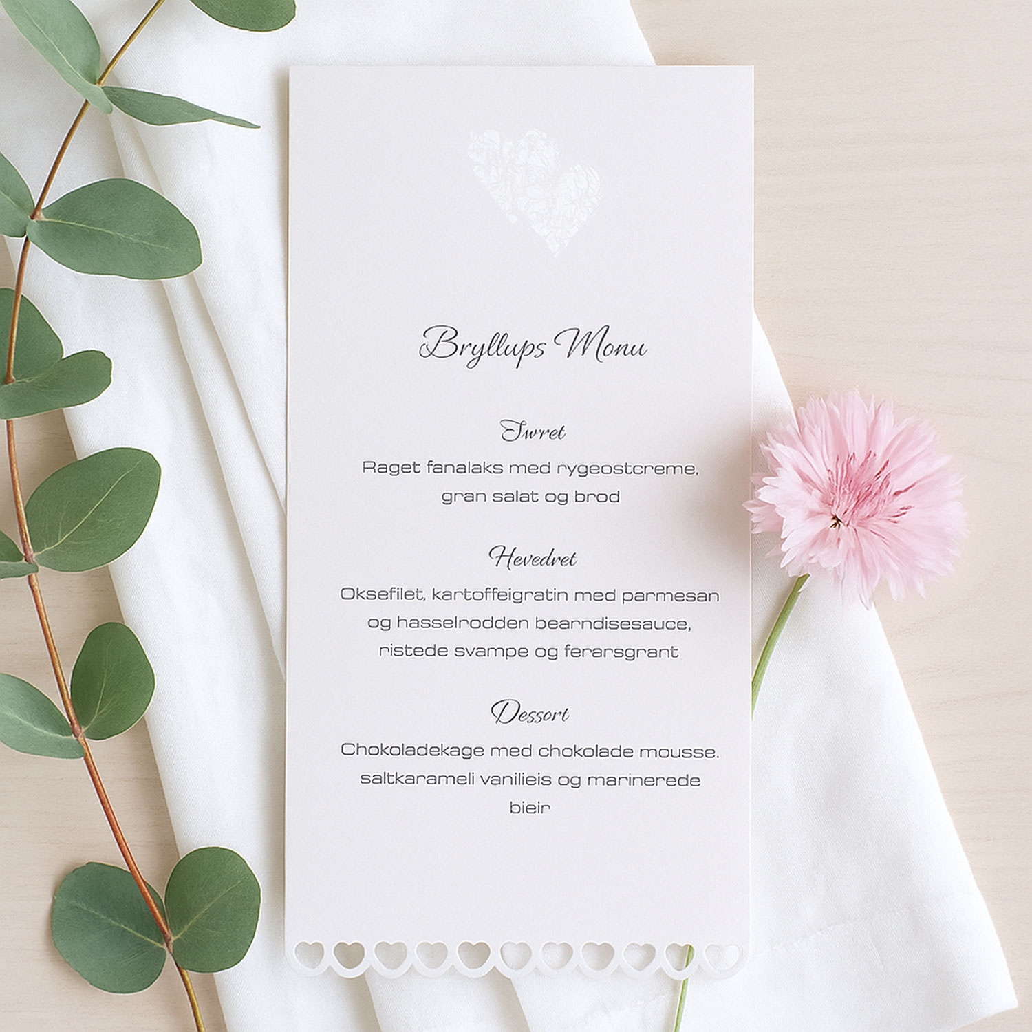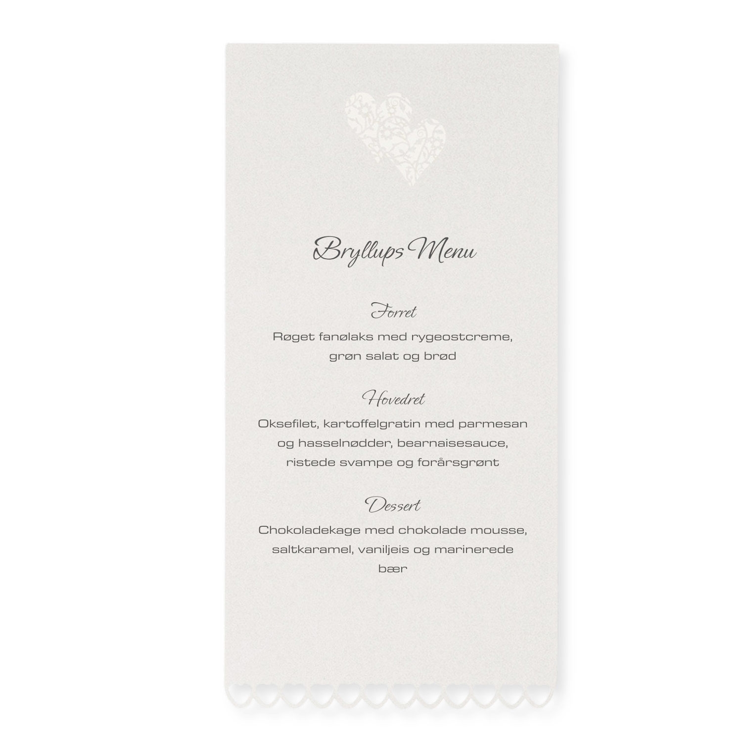 Menukortet er lavet af hvidt karton med en skinnende blank finish. I toppen er der udskåret to sammenhængende hjerter, der sammen med rækken af udstansede hjerter i bunden giver kortet et romantisk look. Sæt menukortet i en holder, sæt det op ad blomsterdekorationen eller en vase, eller læg dem på bordet/bordene.