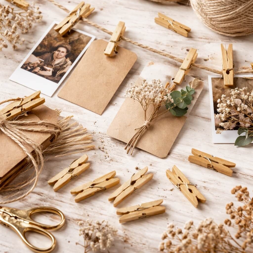 Små træklemmer i guld 3,5 cm – dekorative mini træklemmer i træ til pynt og DIYSmå træklemmer i guld brugt kreativt til scrapbooking, kort og DIY dekorationSmå træklemmer i guld brugt som bordkort og pynt på elegant festbord med lys og blomsterSmå træklemmer i guld brugt til pynt, fotos og kreative DIY-projekter på rustik overflade