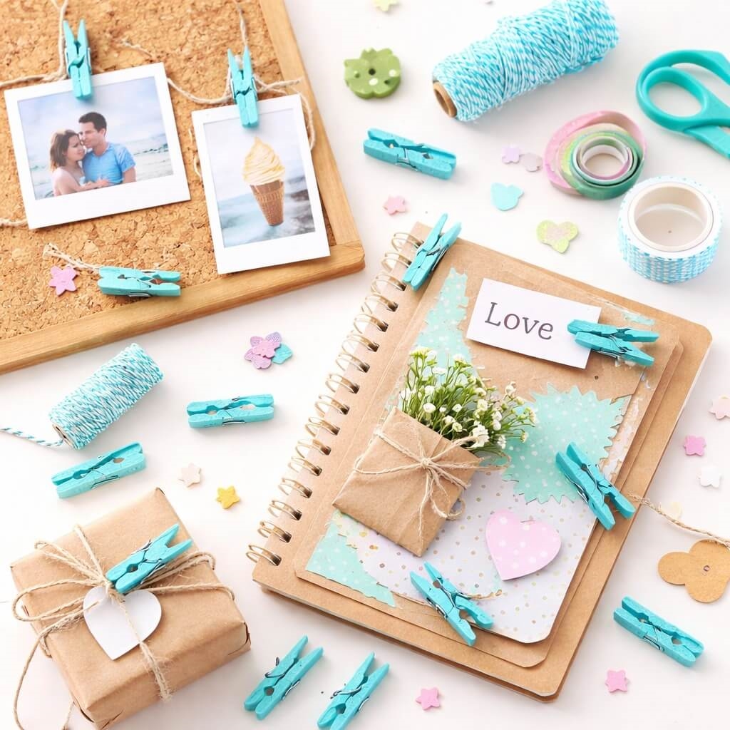Turkise træklemmer brugt til kreativ DIY, scrapbooking og gaveindpakning med fotos, papir og dekorationSmå turkise træklemmer i træ 3,5 cm – 24 stk til pynt, dekoration og DIYTurkise træklemmer brugt som pynt på festbord til drenge barnedåb med babydekoration, cupcakes og borddækningTurkise træklemmer brugt til pynt på festbord til drenge barnedåb med cupcakes, borddækning og dekoration