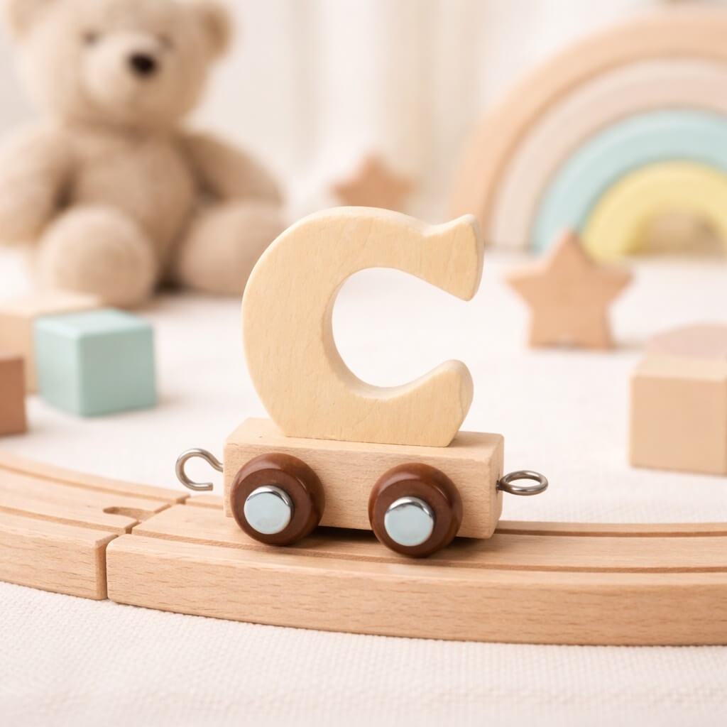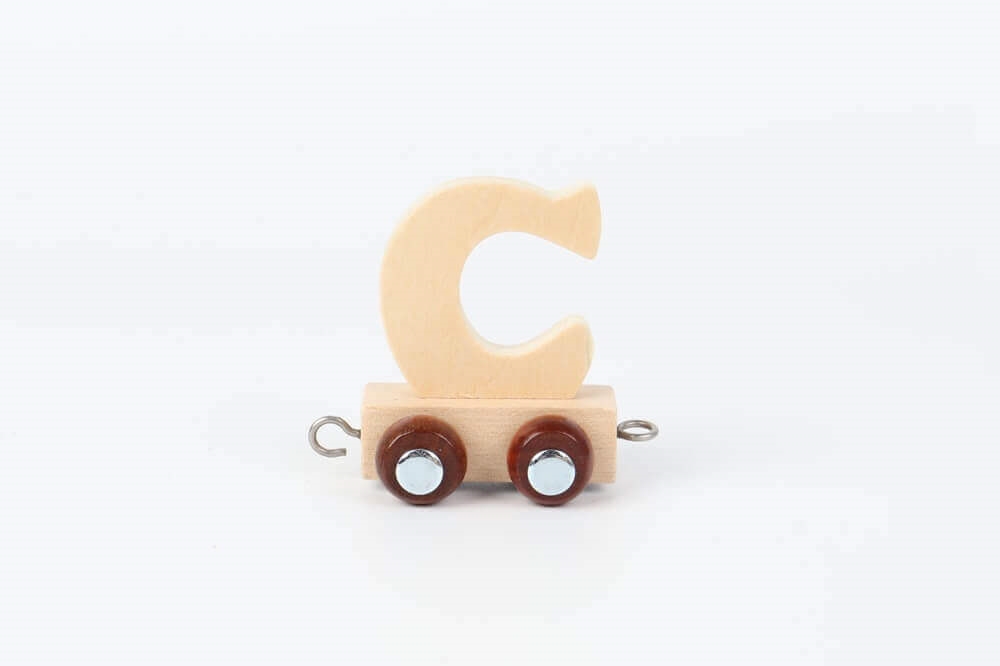 Personligt navnetog bogstav C i naturtræ. Passer til BRIO-kompatible skinner og kan kombineres med andre bogstaver. Perfekt gave til børn.