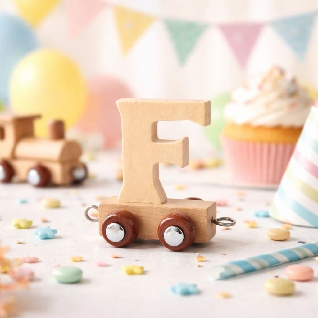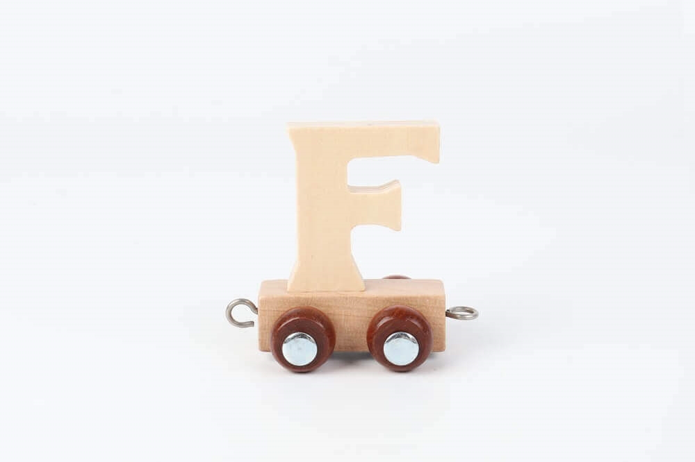 Navnetog bogstav F i naturtræ som trælegetøj på børneværelse med bamse, regnbue og plante i baggrundenNavnetog bogstav F i naturtræ som trælegetøj på bord med farverig børnefødselsdag pynt, cupcake og balloner i baggrundenNavnetog bogstav F i naturtræ som trælegetøj togvogn på hvid baggrund